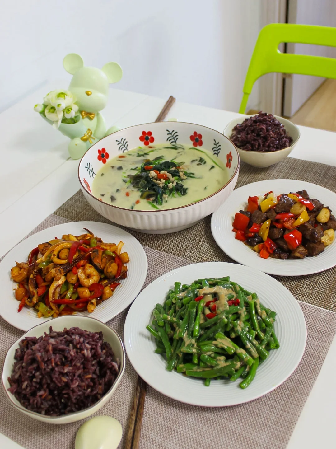 1⃣️口水鸡+酱烧豆腐+杭椒炒肉+炝拌苦菊 2⃣️蜜汁鸡翅+芹菜木耳炒肉+凉拌黄瓜+蒸冬枣 3⃣️蒜蓉大虾+蔬菜蛋卷+韭菜炒鸡蛋+老虎菜 4⃣️辣椒茄子+黄瓜鸡蛋+海米油菜+鸽子汤 5⃣️剁椒鱼+ 蔬菜蛋饼+凉拌洋葱+玉米汤 6⃣️苦瓜酿肉+蒜蓉粉丝虾+豆豉鲮鱼油麦菜+小葱豆腐 7⃣️彩椒牛肉粒+辣炒海鲜什锦+ 上汤菠菜苗+ 蒜泥豇豆