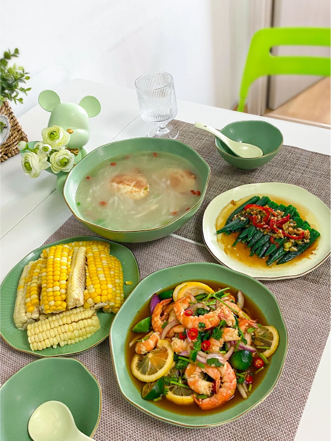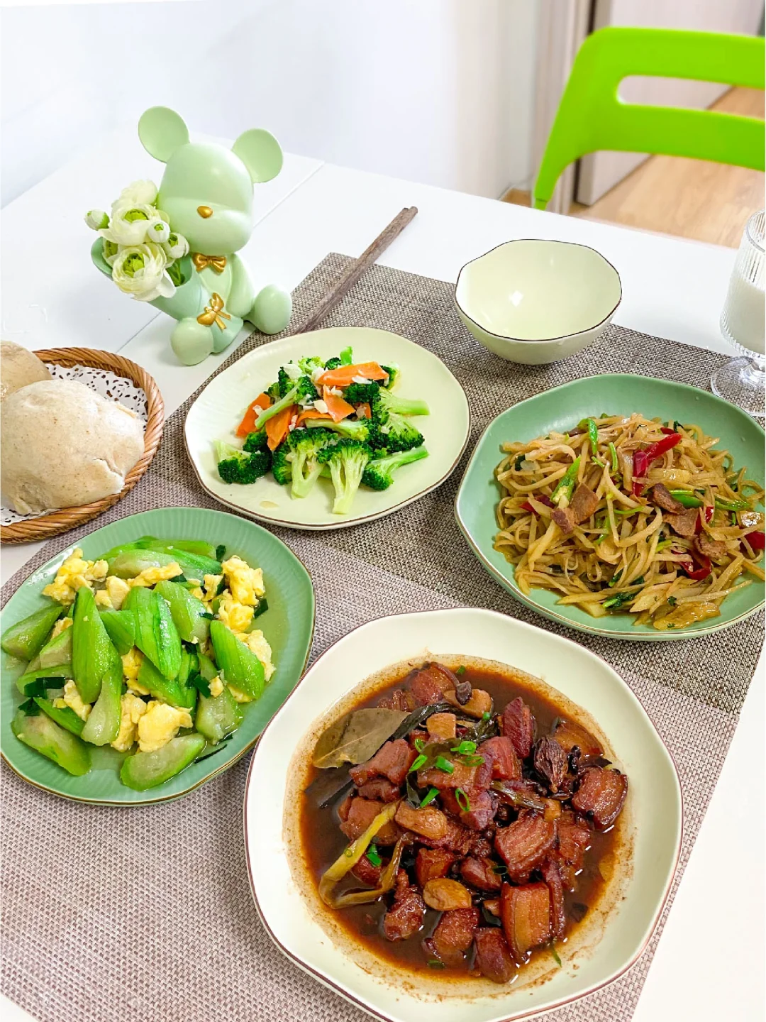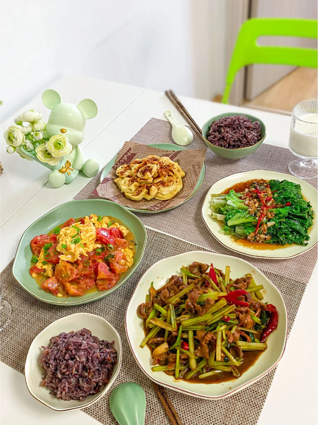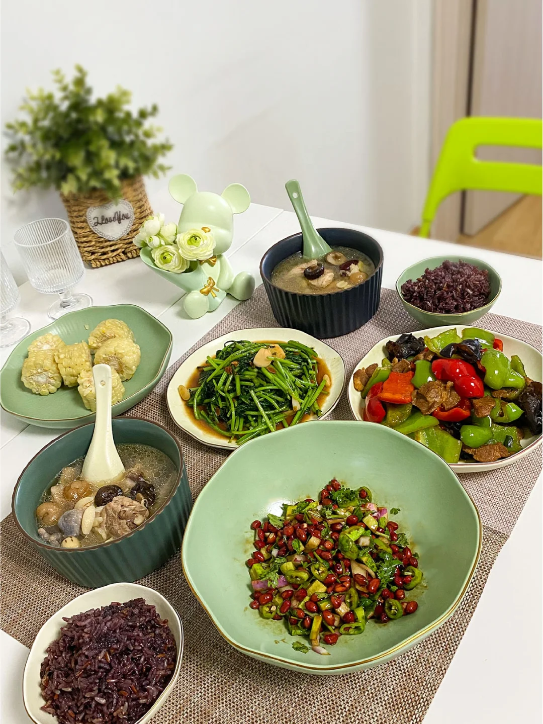1⃣️蒜香茄子+苦瓜鸡蛋+清炒空心菜+玉米萝卜排骨汤2⃣️清蒸巴沙鱼+清蒸虾+毛豆炒肉+芦蒿炒香干 3⃣️丝瓜蛏子+香菇油菜+紫菜蛋花汤 4⃣️酸辣柠檬虾+白灼秋葵+萝卜丝煎蛋汤 5⃣️辣炒鸡胗+西红柿鸡蛋+包浆豆腐+白灼生菜 6⃣️老醋花生+辣椒炒肉+清炒茼蒿+鸡汤 7⃣️红烧肉+酸辣土豆丝+蒜蓉西兰花+丝瓜鸡蛋