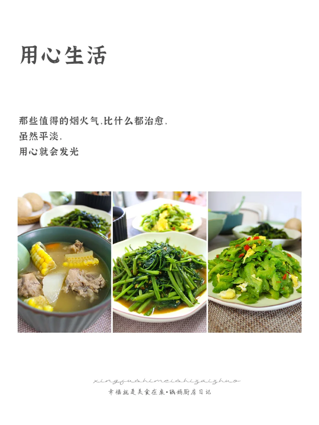 今日菜单: 👍【玉米萝卜排骨汤】鲜甜美味 👍【蒜香茄子】低油减脂,爱吃茄子的做起来 👍【苦瓜炒鸡蛋】加剁椒超好吃,快试~ 👍【清炒空心菜】每日必吃绿叶菜 那些值得的烟火气,比什么都在治愈 虽然平淡,用心就会发光