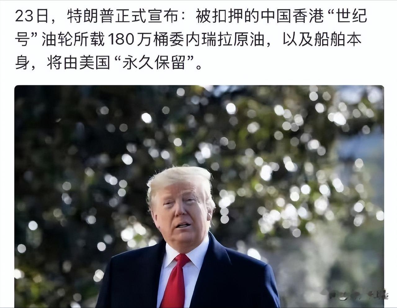 美国将“永久保留”中国油轮,又发明了一个“抢劫”同义词[赞][赞] 12 月 20 日美军彻底撕下了美式霸权的虚伪面具,直升机索降登船、无授权控制船只、径直扣押 200 万桶原油,全程没有联合国授权,更没有合法扣押文件,特朗普一句 “永久保留” 就把海盗行径包装成 “执法行动”。 这艘由中国香港企业运营的油轮手续合同完整合规,本应驶向中国南方炼化基地。 美方动武的真正目的是中委绕开美元的结算模式与能源合作根基。 美国试图通过切断委内瑞拉对华出口通道,既能瘫痪其经济命脉,又能打击中国能源安全,更可维系摇摇欲坠的美元石油霸权。 所谓 “打击贩毒” 不过是借口,美方至今拿不出涉毒证据,却已将原油纳入战略储备计划。 正如中国外交部所斥,这是严重违反《联合国宪章》的单边霸凌,俄罗斯代表更直斥其为 “牛仔式海盗行为” 公海不是美国私域,规则不应沦为霸权工具。 美方短期抢得一船原油,长期却在消耗全球对其的信任。 当 “文明” 国家公然拥抱强盗逻辑,只会加速国际社会对多元结算与自主安全的追求,这或许正是霸权崩塌的开始。