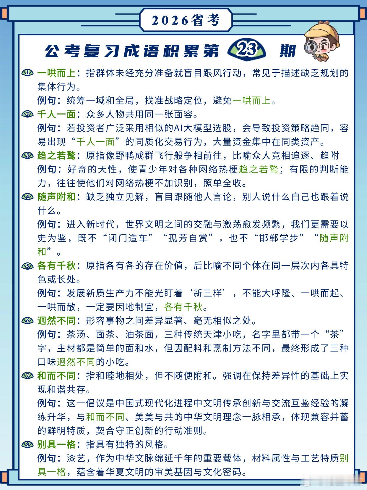 26省考成语积累第23天一哄而上 千人一面 趋之若鹜 随声附和各有千秋 迥然不同 和而不同 别具一格开学元气加油站决战公考国考省考国考