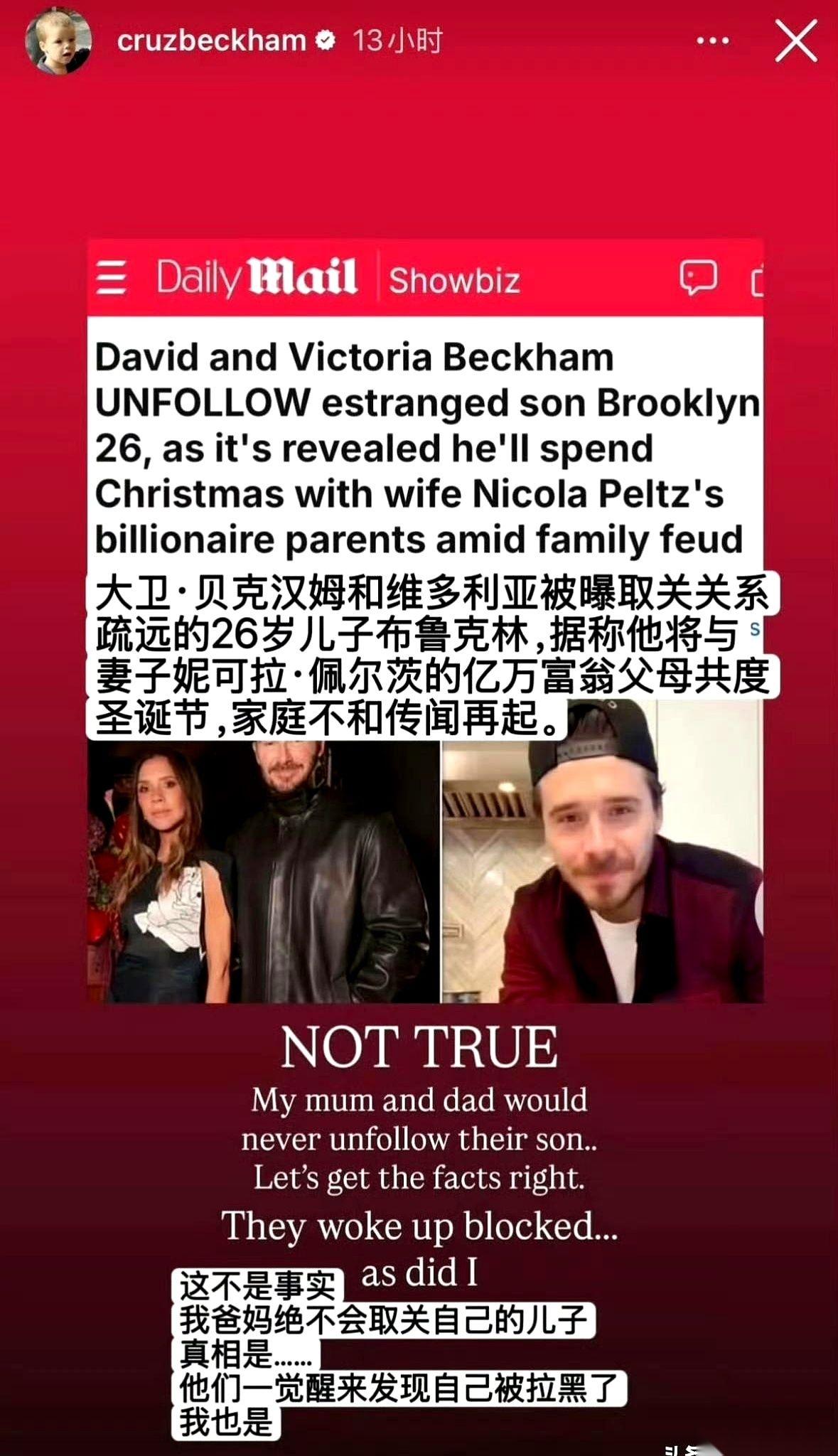全世界都羡慕的老贝家,塌房了。 亲儿子,大布鲁克林,直接在社交媒体上把爹妈、兄弟