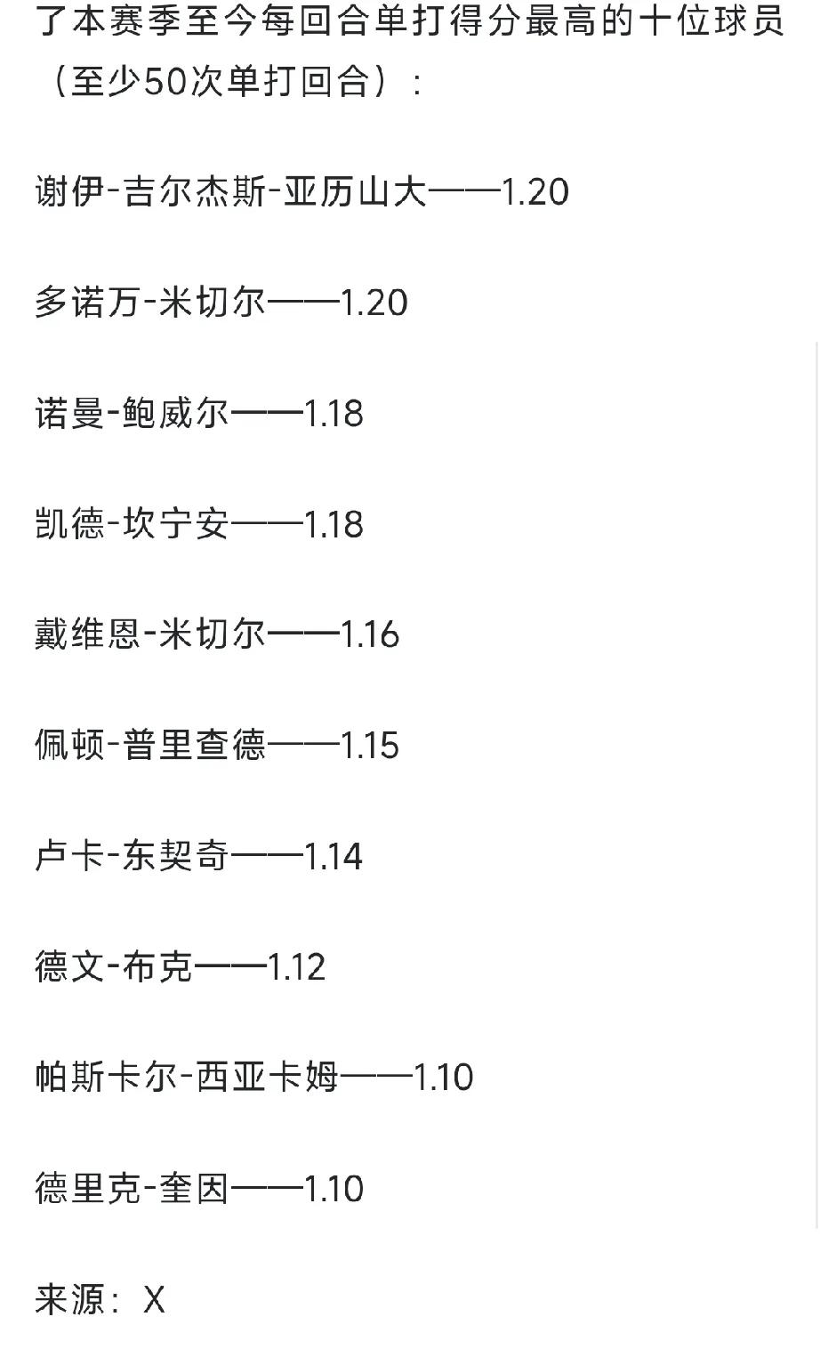 本赛季每次单打得分前十: 雷霆的亚历山大和骑士的米切尔一每回合1.2高居榜首,紧随其后的是鲍威尔和坎安宁,此外,像东契奇和布克这种单打高手也顺利入围,但是像哈登库里,杜兰特这几个人就没有在榜单内,实际上,杜兰特的单打效率排联盟倒数第十!
