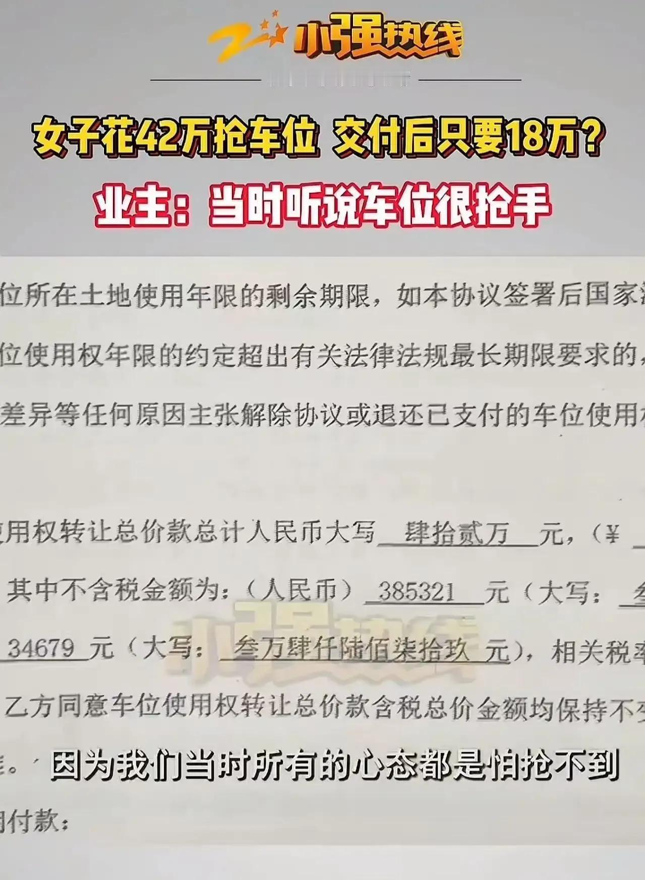 浙江杭州一女子花42万抢了个车位,本以为捡了个大便宜,结果交付时发现车位竟只要18万!这价格腰斩的落差,让女子直呼上当,究竟怎么回事? 原来,女子在购买车位时,销售告诉她车位非常抢手,仅剩几个,让她赶紧下手。出于对销售的信任,女子毫不犹豫地支付了42万。然而,当车位交付时,她却发现车位价格竟然降到了18万,而且还有几百个车位空着。这巨大的价格落差,让女子感到被欺骗,她表示:“我当时就是被销售的话给骗了,现在价格这么低,我要求退车位!”此事件一出,立刻引发了网友们的热议。有网友表示同情女子的遭遇,认为销售行为存在误导;但也有网友提出质疑:“那我买的房子跌了,能要求退吗?”这个问题确实值得深思,毕竟市场有风险,投资需谨慎。不过,对于销售是否存在误导行为,以及女子能否成功退车位,还需要进一步的调查和了解。 车位价格腰斩,女子要求退车位,这事你怎么看?是销售误导还是市场风险?快来评论区发表你的看法,一起讨论吧!小区车位 车位 购买车位 车位价格争议
