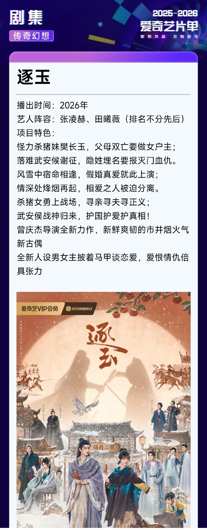 张凌赫 田曦薇逐玉暂定爱奇艺腾讯2026播出的开年大剧