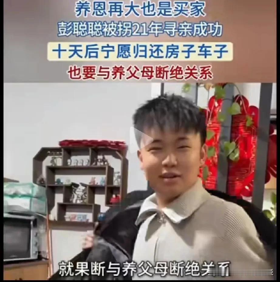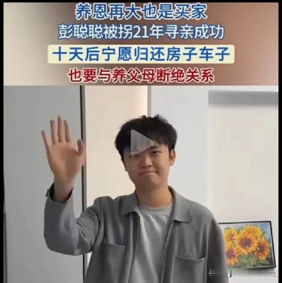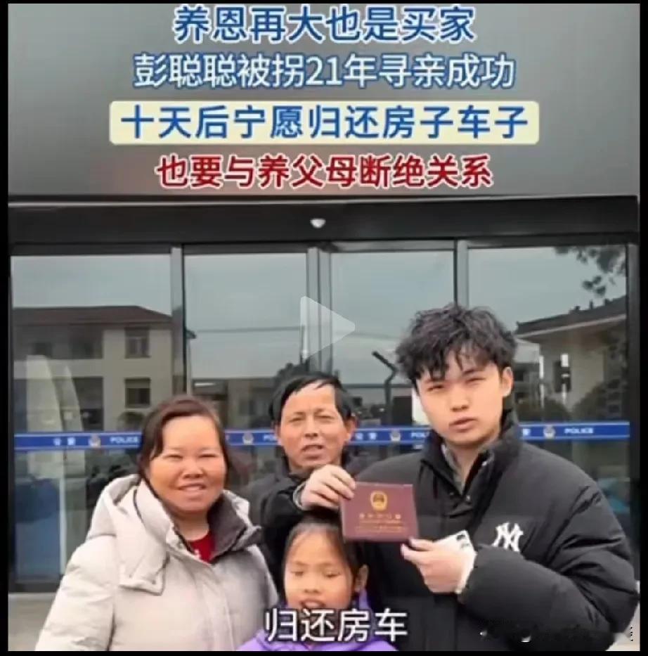 他被拐21年,寻亲成功,选择回归原生家庭,有人却骂他是白眼狼。彭聪聪4岁的时候被拐卖,21年后他寻亲成功,果断注销户口,归还房车,离开养父母回归原生家庭。他的举动出现了两种声音。 1⃣️有人恭喜他终于回家了,回到了亲生父母身边,这是任何一个正常人都会做的选择。2⃣️有人说他白眼狼,养父母含辛茹苦把他养大,还供他上大学,找工作,买房子买车子,准备结婚。他如今啥都不要了,说走就走,离开了养父母,不懂得感恩,白养了他21年,养个小猫小狗也会感恩。他潇洒离开,养父母怎么活。 第二种声音属于道德绑架,他是被拐卖,没有买卖就没有伤害。养父母卖孩子就错在前,人家父母不会抚养吗?还需要你一个陌生人来抚养。骂他白眼狼的人,你想过他的生身父母这21年怎么过的吗?