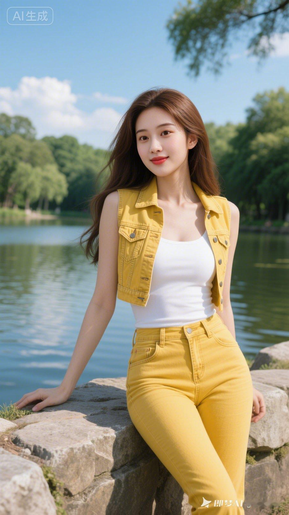 阳光明媚的公园,少女坐在湖边,黄色牛仔装搭配白色背心,清新自然。