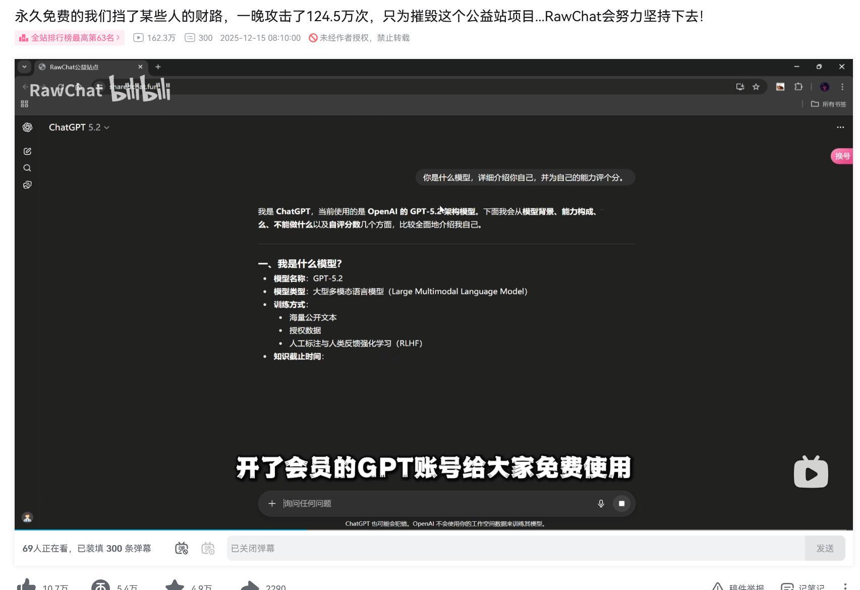 这个up做了一个免费的镜像站提供chatgpt聊天,然后就被一些人干了可以,很符