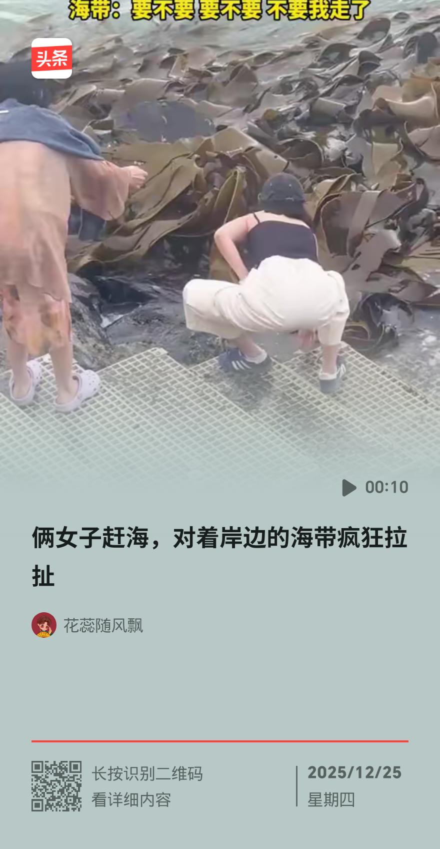 广西两女子海边薅海带薅到崩溃!忙活半天空手而归 网友:这海带会“走位” 广西海边上演了一出搞笑又无奈的抓海带大戏。两名女子海边闲逛时,偶遇一大片鲜嫩海带被海浪冲到岸边,当即决定薅点回家炖汤。 两人分工协作轮番上阵,踩着岸边台阶使劲拽海带。无奈海浪一波接一波,泡得透透的海带滑溜溜的,刚攥紧就被浪冲脱手,使劲扯要么只拽下一小截,要么整根被卷回海里。来回折腾数次,两人头发衣服全湿透,累得够呛,愣是没捞着一根完整海带,最后只能哭笑不得地作罢。 这一幕被游客拍下传到网上,网友们纷纷调侃,有人直言免费鲜海带谁看了不心动,也有人隔空着急,直呼隔着屏幕都想伸手帮忙。 其实秋冬季节海边飘海带很常见,此时海水温度适宜、近海水质干净,野生海带长势旺盛,遇上大风浪就容易被卷到岸边。有经验的人支招,捞海带得趁退潮,还得带夹子,光靠手抓根本行不通。 不过也要提醒大家,海边浪大湿滑暗藏风险,想吃海带还是去市场买更稳妥,海边游玩,安全永远是第一位的。海带 海藻海带 海带脆嫩爽口 盐渍海带