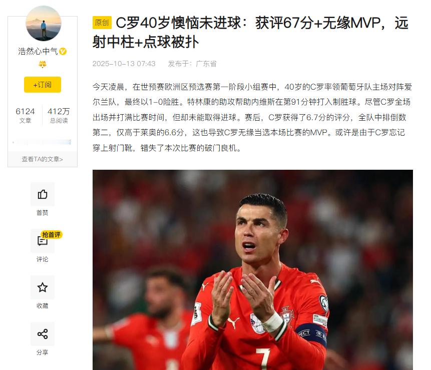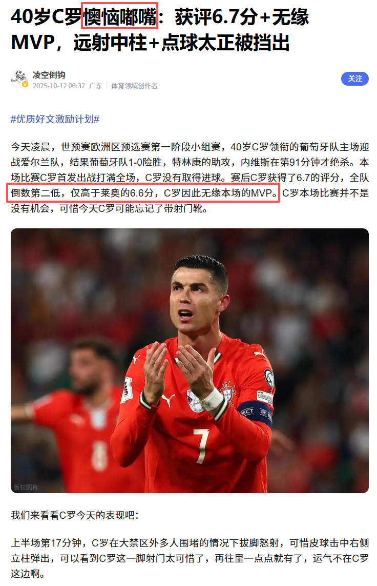 C罗 遗憾 以后又现C罗 懊恼 C罗还曾打出破10分的67分高分,震惊足坛(实则是把小小的小数点隐藏了)