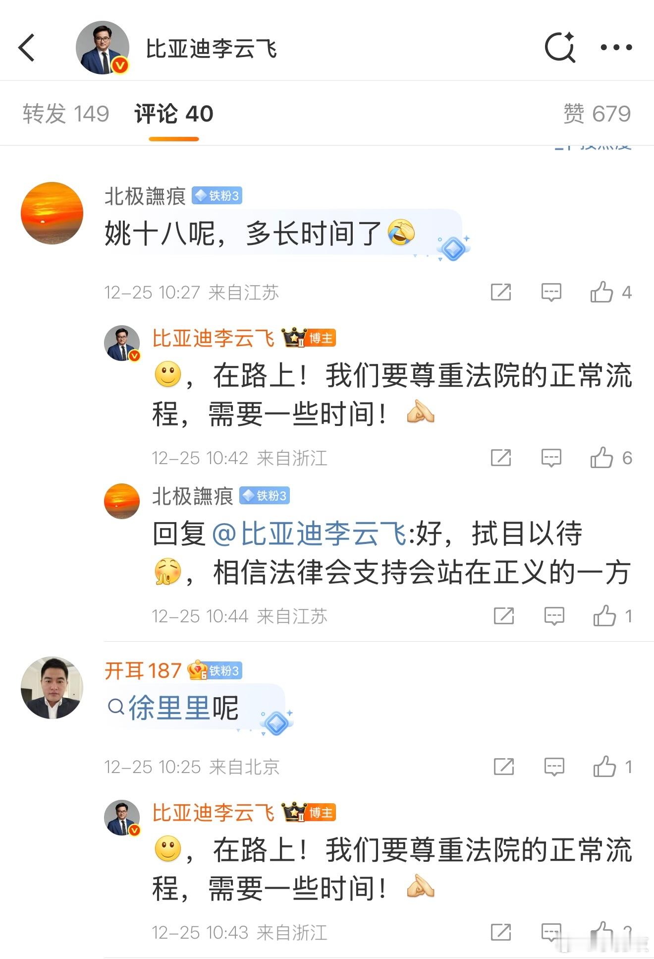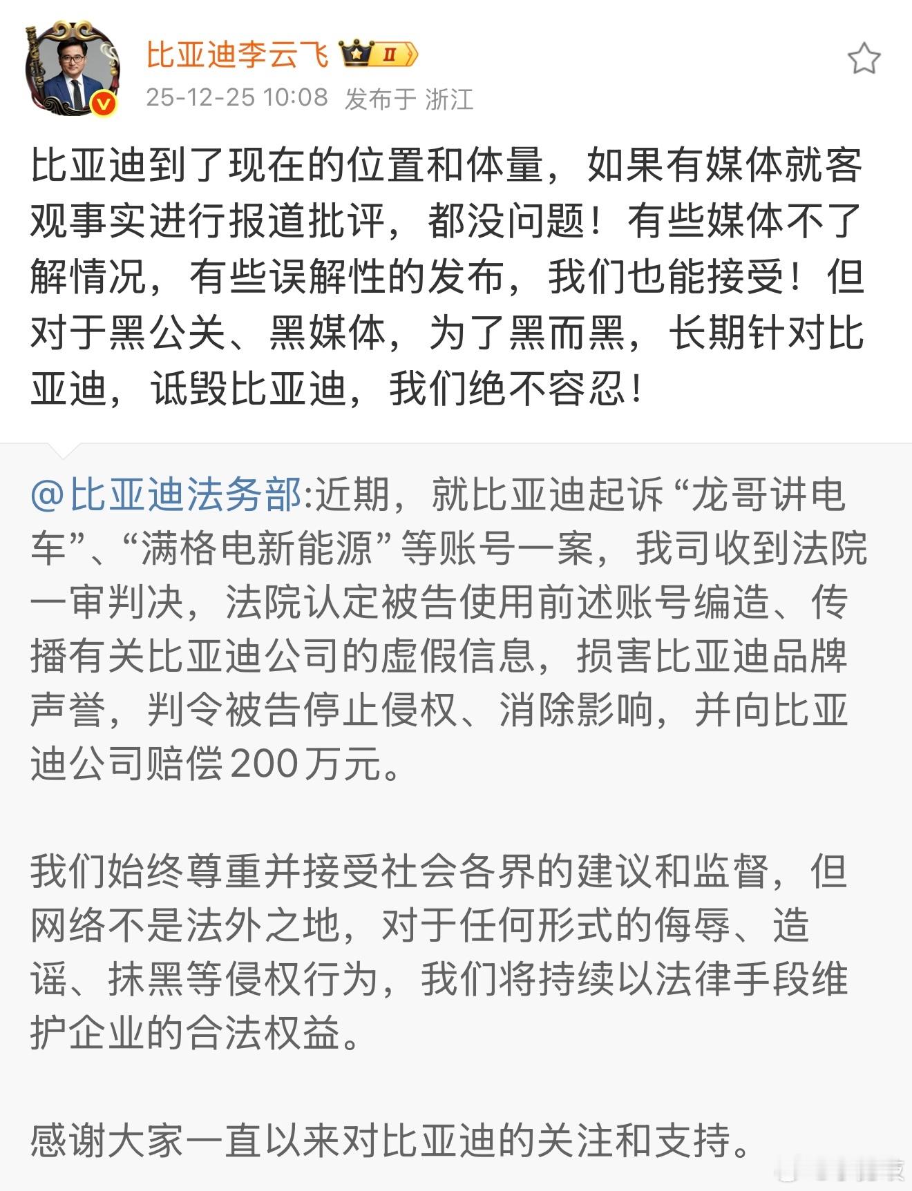 黑粉瑟瑟发抖?比亚迪李云飞回应黑公关!“姚十八”、“徐里里”已在路上法院判决自媒体赔偿比亚迪200万元12月25日,比亚迪法务部账号官方通报,“龙哥讲电车”、“满格电新能源”等自媒体,被判赔偿比亚迪200万元,随后,比亚迪集团品牌及公关处总经理发文称:“比亚迪到了现在的位置和体量,如果有媒体就客观事实进行报道批评,都没问题!有些媒体不了解情况,有些误解性的发布,我们也能接受!但对于黑公关、黑媒体,为了黑而黑,长期针对比亚迪,诋毁比亚迪,我们绝不容忍!”另外据评论区透露,“姚十八”、“徐里里”等侵权账号也在路上了!打击黑公关一直在行动,大家怎么看?
