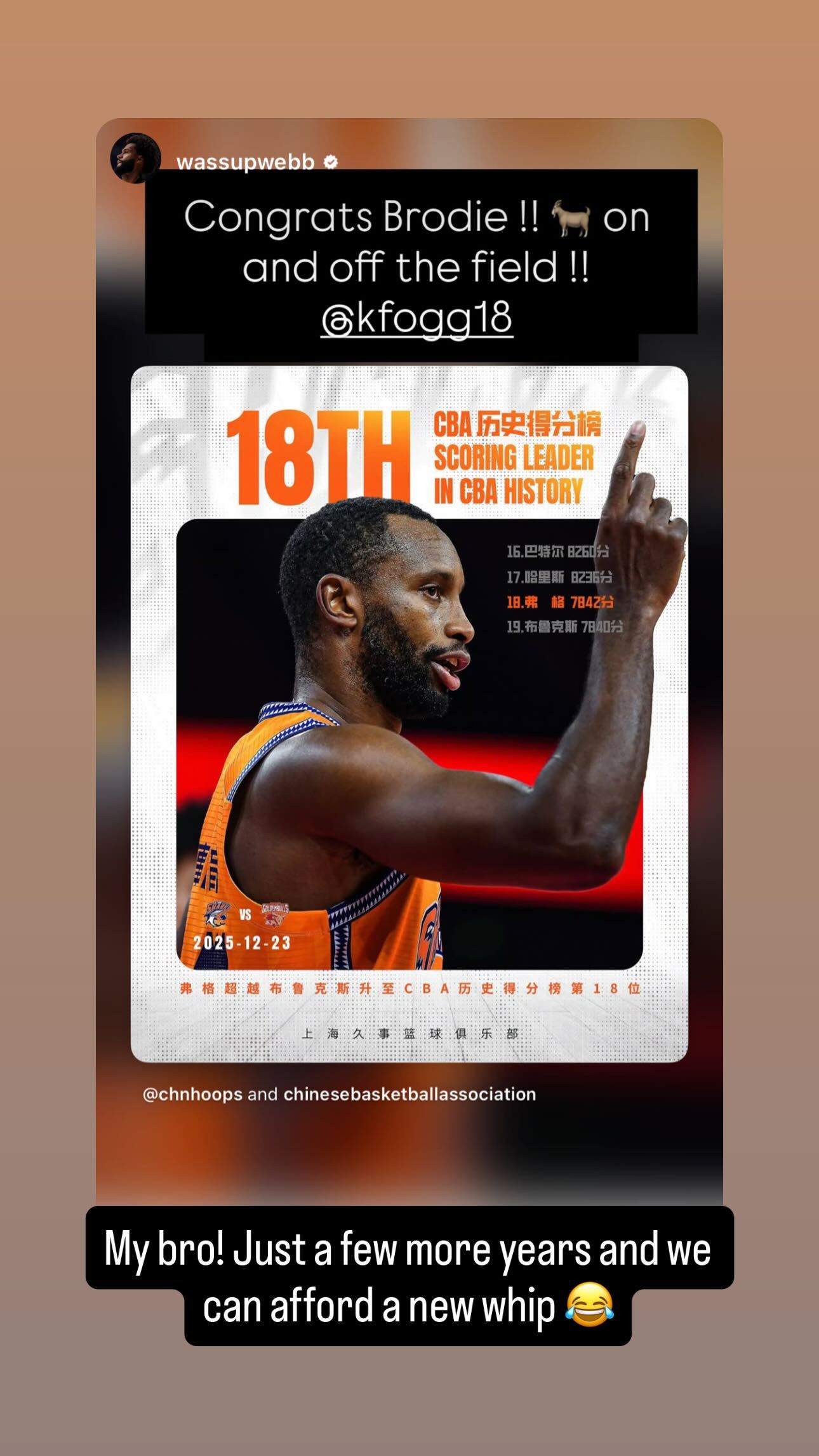 乌戈教练、威尔斯、詹姆斯韦伯、训练师华莱士都转发弗格CBA得分榜升至18位,并祝贺。弗格人好,我们这个团队也好。辽宁男篮