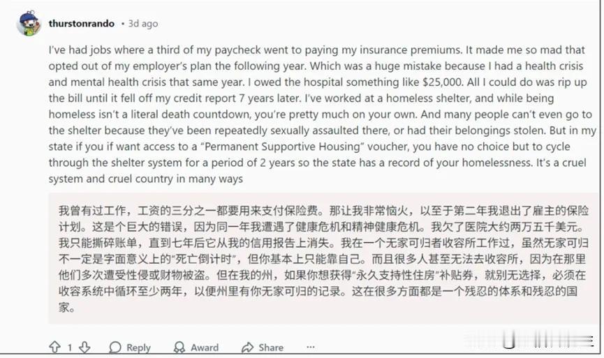 美国中产斩杀线证词之一 高昂的商业医疗保险是中产斩杀的一把屠刀! 关于美国中产斩杀线的说法出口到美国,很多美国人也开始现身说法,认同“斩杀线”的说法。 关于美国高昂的医疗费用,比如有个美国人说他的工资1/3用来支付保险费,第二年就退出保险计划,但他退出后,就遭遇危机,欠了医院2.5万美元费用,花了7年才把违约记录从信用报告上消失。 有个美国网友说:“在医院生一个孩子大约需要7万美元”。 在美国问答网站上,2020年在美国医院生孩子需要花费大约4万美元,美国人怎么能负担得?” 有个美国人在2024年3月30日,晒了她生孩子的费用,她提到:“生孩子的总费用超过7万美元,其中我已经支付了大约4500 美元,我的保险支付了其余部分。即使她的保险报销完,生孩子费用对她来说仍然是一个很大的负担。 短短4年时间,美国生孩子的费用就从4万美元飙升到6.5万美元,这也是过去4年美国高通胀的一个体现。 朋友带两个孩子在美国读书,一个人一个月医疗保险费好像是五百多美金。 网友晒在美国看病的账单。 ​住院大概6天,总费用8万多美元。床位费一天3200,手术室占用一个小时是18000,一袋100ml生理盐水是35美元,喂一次饭都几百美元。 美国一个CT要1000美刀,上海三甲医院收费刚降到189元人民币,都同样的GE,西门子做的CT,价格差了几十倍? 基本上美国过去4年,大多数物价都上涨了50%以上。 所以,这次美国网友说现在美国生孩子要7万美元,应该是真的。 还有个美国网友晒她在急诊室3个小时的总费用是1.79万美元。 美国医疗也是出了名的昂贵,所以美国人基本都得买高额的商业医疗保险。 但商业医疗保险又很贵,那个美国老哥说的,他的保险费用占了他1/3工资,不买还不行。 中国也有大病医保,每年交几百人民币。 如果有保险,保险公司会报销85%,100万,患者可能只需要出15万甚至更少,但别以为保险公司会真的出那85,中间都时有PY交易的,保险公司可能只需要出5万,这事情就算了了。 医院为了获取更多的赔付,开的账单跟刚从水里捞出来的一样,10万的医疗费用他敢给开100万,但如果没有保险,不好意思,100万你得全掏,不讲价一毛钱都不能少。 美国如今依然有大量的人群没有购买保险,哪怕进一次医院就会导致自己破产也照样不买,美国因为医疗破产的人群占到了总美破产人群总数的62%。 美国是全世界发达国家中,唯一没有实行全民医保的国家,所有人都只能自行购买保险,而美国8000家保险公司全部为私有。 这些保险公司整天就干一件事情,想办法拒保,以及将保险服务无所不用其极的细化。 这些刚性支出把美国人的高收入占据了大部分。 美国越来越让人难以忍受的医保模式了。 布莱恩·汤普森,全美最大的健康保险公司CEO,于1月初在曼哈顿的酒店外被枪杀后,美国网民几乎都在庆祝。 美国普通人本身存不下什么钱,但是如果没有买商业医保,高风险会掉落斩杀线! 一些美国人需要靠卖血来维持生计。 乃至都出现“卖血请朋友喝星巴克”这样的说法。 还有一些“全款买菜”、“助学贷款利滚利”,这类我们很多人都想象不到的名词。 此外,很多人美国人也证实,需要有固定住所才能找到工作的说法。 只需要知道身份证号,不需要有固定住所,就能找到工作,而这在美国成了一种奢望。 很多我们觉得理所当然的事情,在不少美国人眼里都成了奢望。 美国作为资本主义大本营,真是把人当耗材当燃料使用,榨干每一个啊 中产阶级风险 美国斩杀线 美国中产 中产财富陷阱 犹太医疗资本 中产医疗 去美国看病应该申请什么签证? 美国穷人看病要钱吗 在西方国家公立医院看病的感受 美国看病贵吗