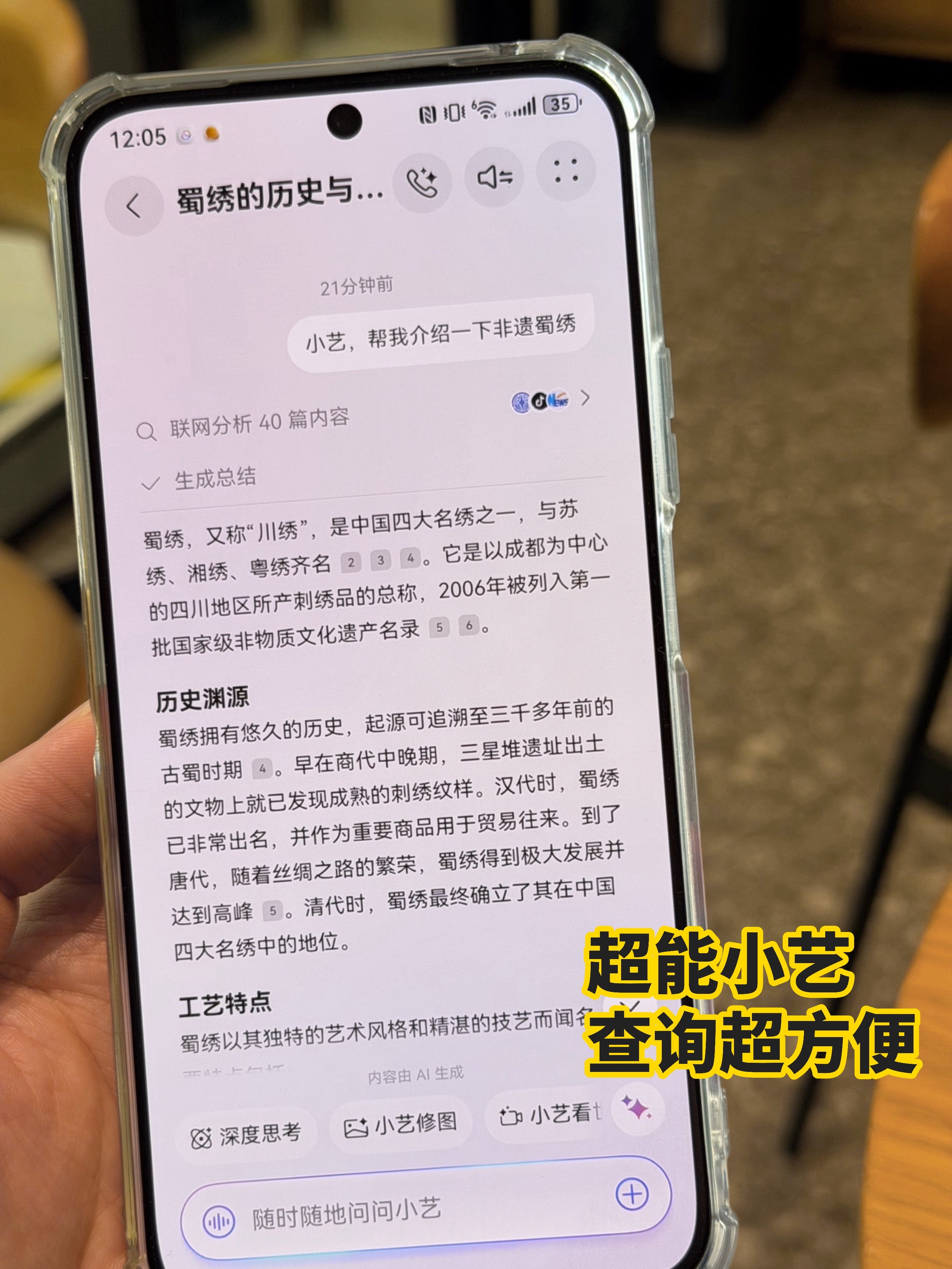 看到微博举办的第二届微博焕新非遗盛典现场,真的好想去。没到现场,也还是被超能小艺在路演现场的那些真人感互动惊艳到!只要用过一次小艺,你就会发现 小艺 怎么那么能干那么实用!说到这不得不先夸夸真人感小艺!真人感小艺不仅有情感,还会说方言,升级后的小艺超能干,支持多种方言,和小艺聊天的时候,听到熟悉的家乡话,有种在家里的感觉。看到非遗活动现场好多感兴趣的东西,想了解但没到现场,没关系,小艺问答帮到你!以前想找点啥都得全网搜还未必搜得到对的,现在只要喊一句小艺,帮我介绍一下非遗蜀绣,小艺嗖嗖嗖的秒出答案,而且还很全面,而且,无论是文档图片还是文本,直接拖给底部导航条收藏进小艺知识库,小艺就能帮你智能分类,还能生成AI播客,上下班通勤就能把这些内容吃透吃懂了。最近新升级的小艺修图我真的好爱,发送一张图片再发送一句指令,小艺就能帮你ai修图,出来的效果还意外的很好!消除路人去反光,对小艺来说都是小菜一碟。用习惯以后真的离不开小艺了,在生活方方面面都把我照顾的很好,完全是我的全能助理,越早用小艺越早拥抱AI时代。 微博非遗盛典首位AI员工上岗