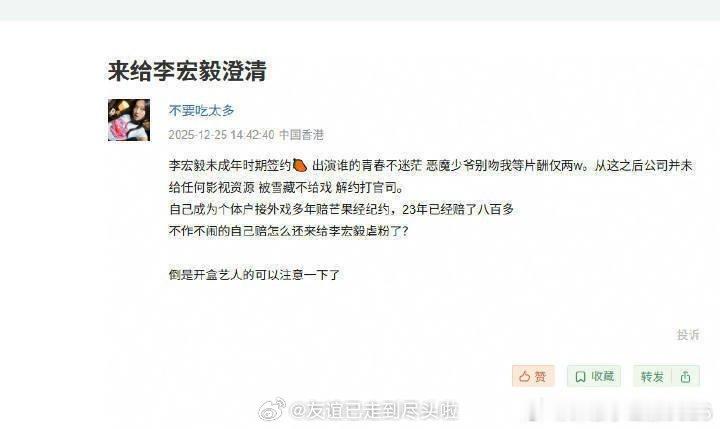 李宏毅 限高李宏毅今天被法院发布限高,粉丝澄清是李宏毅未成年人时家人签了芒果,演了两部糊剧,后来自己成个体户接戏,结果被公司起诉已经赔了几百万(300还是800w?),但是公司主张2023年前的所有戏应该没收所有收入