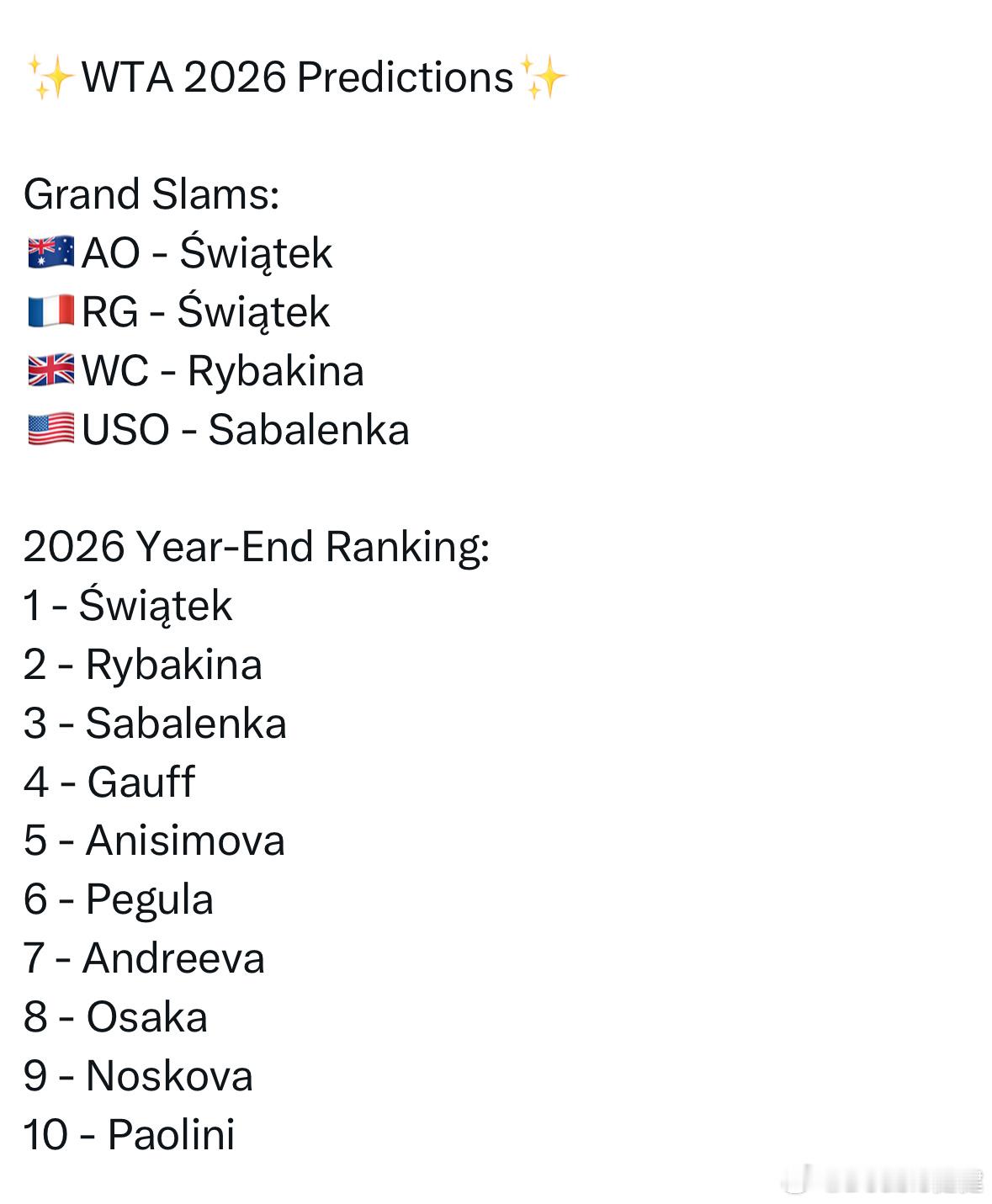 网友预测明年四大满贯冠军:澳网:斯瓦泰克法网:斯瓦泰克温网:莱巴金娜美网:萨巴伦卡还预测2026年终排名:1、斯瓦泰克2、莱巴金娜3、萨巴伦卡4、高芙5、阿尼西莫娃6、佩古拉7、安德列娃8、大坂直美9、诺斯科娃10、泡里尼澳网2026