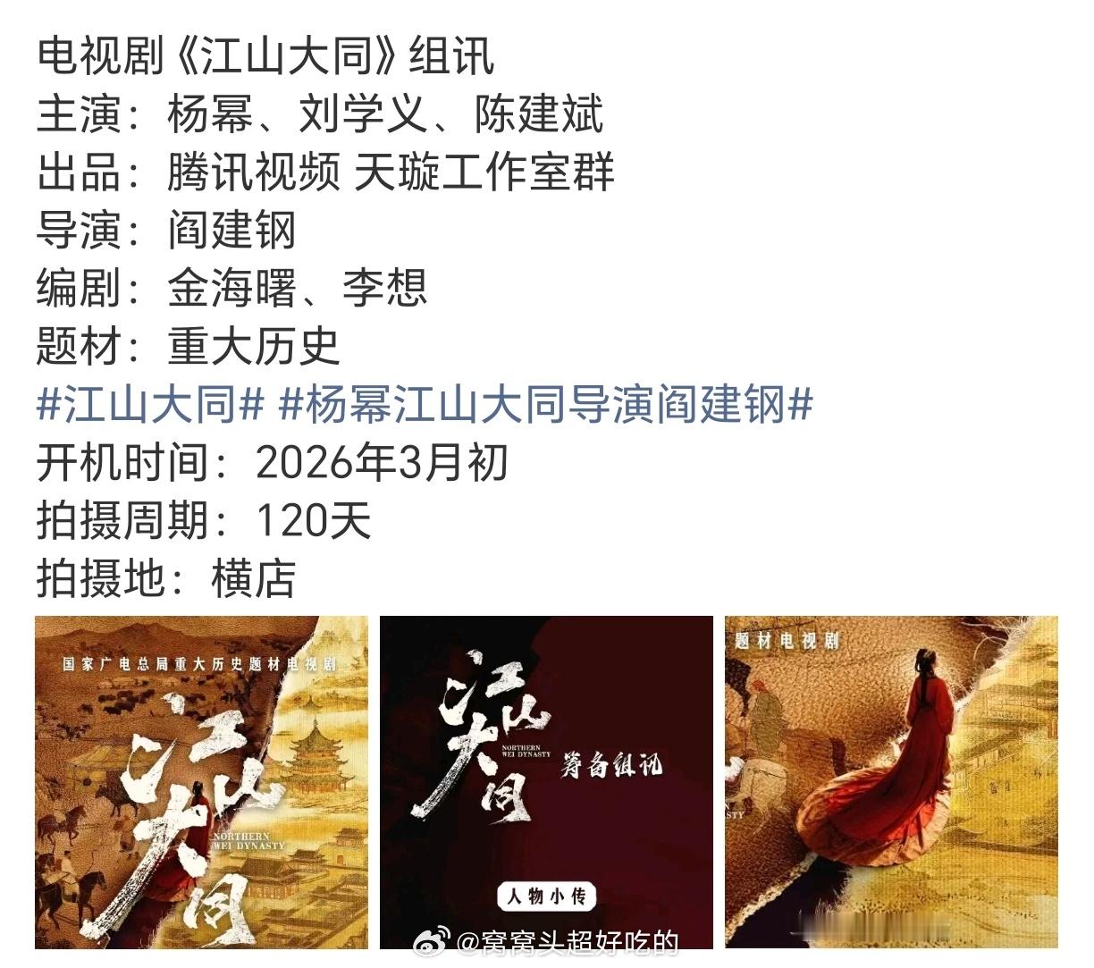 刘学义离开欢瑞好起来了,年初参加了央视春晚,上个月录制央1大型文化节目《金石探文明》和央4的《目的地,中国》,现在又传央视重大历史题材《江山大同》,合作演员班底都是牛逼的,学长越来越好👍