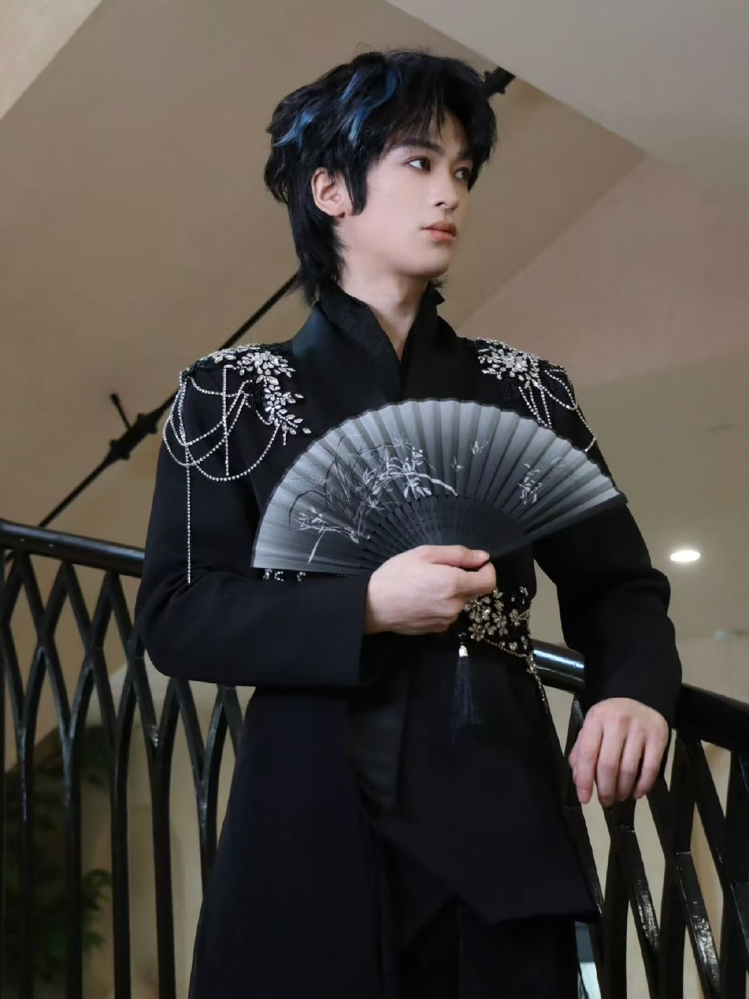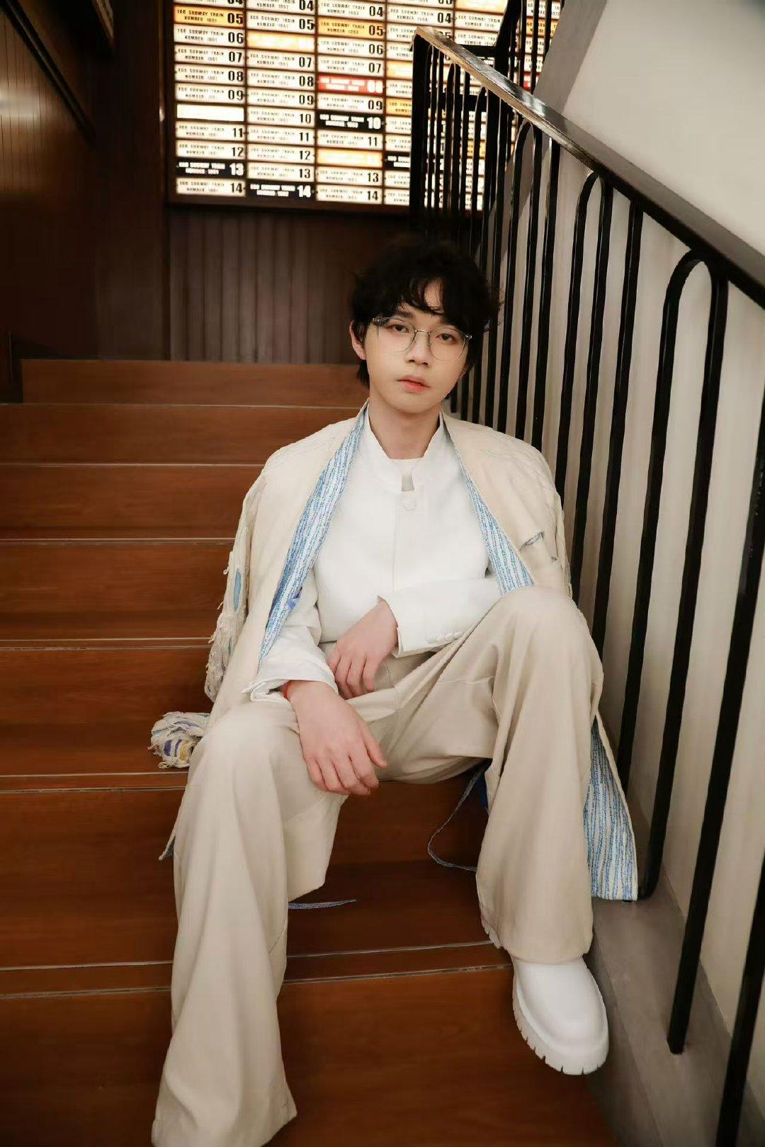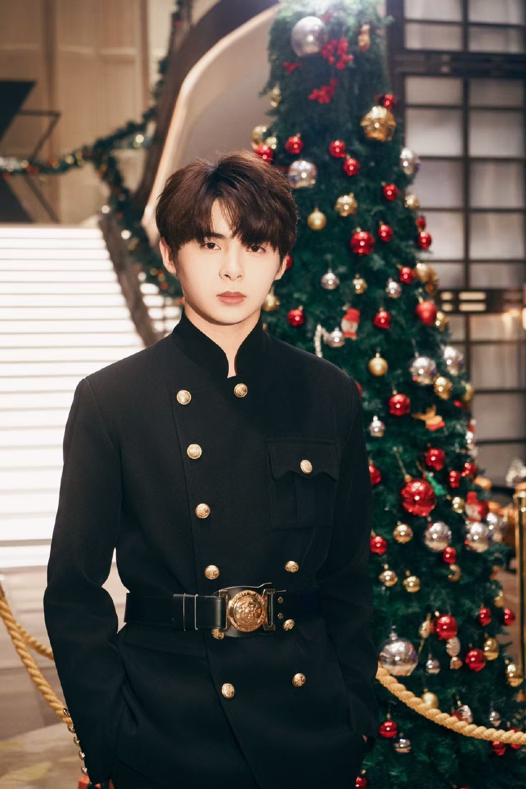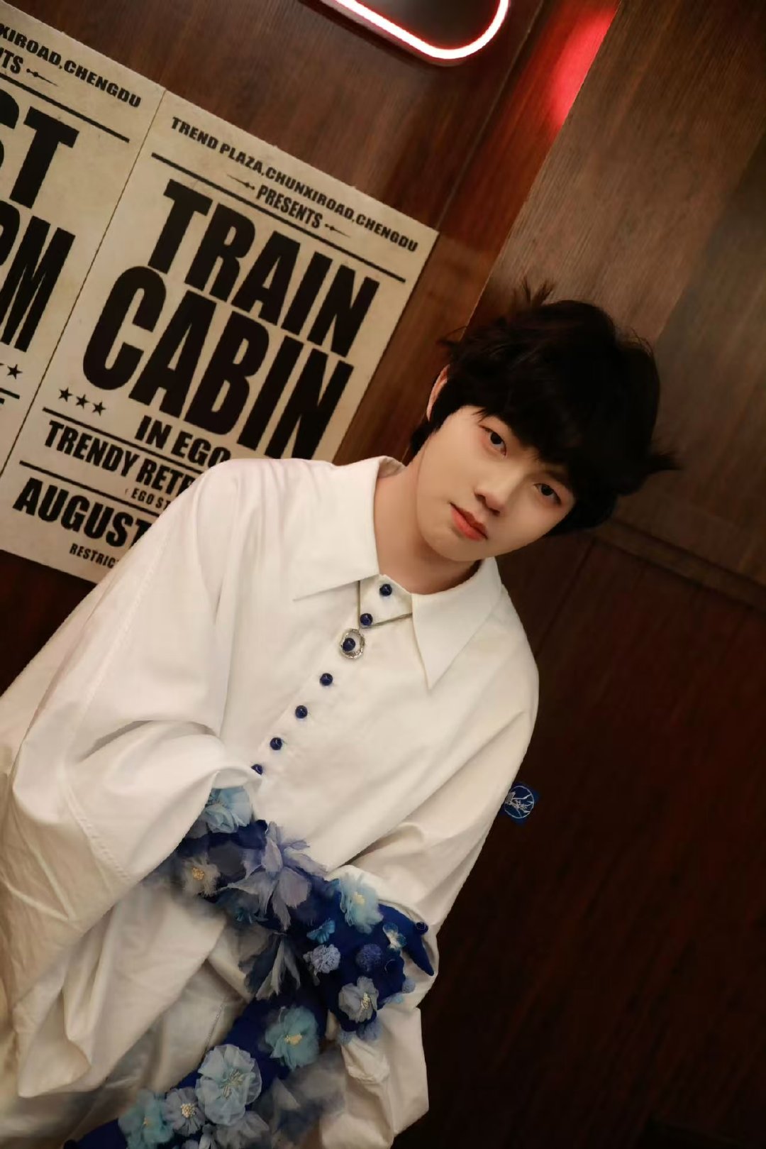 蓝白亮片缀满肩线,一步一闪像是把晴空与云絮都穿在了身上。吒宝把蓝天白云穿在身上