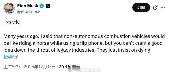 特斯拉官方发文称,将来无法实现自动驾驶的车就像,配图为一部古董手机“大哥大”。12 月 17 日,特斯拉首席执行官埃隆・马斯克在社交网络上评价称,没有自动驾驶能力的燃油车,就像“骑着马用着翻盖手机”。特斯拉308_IO新能源汽车