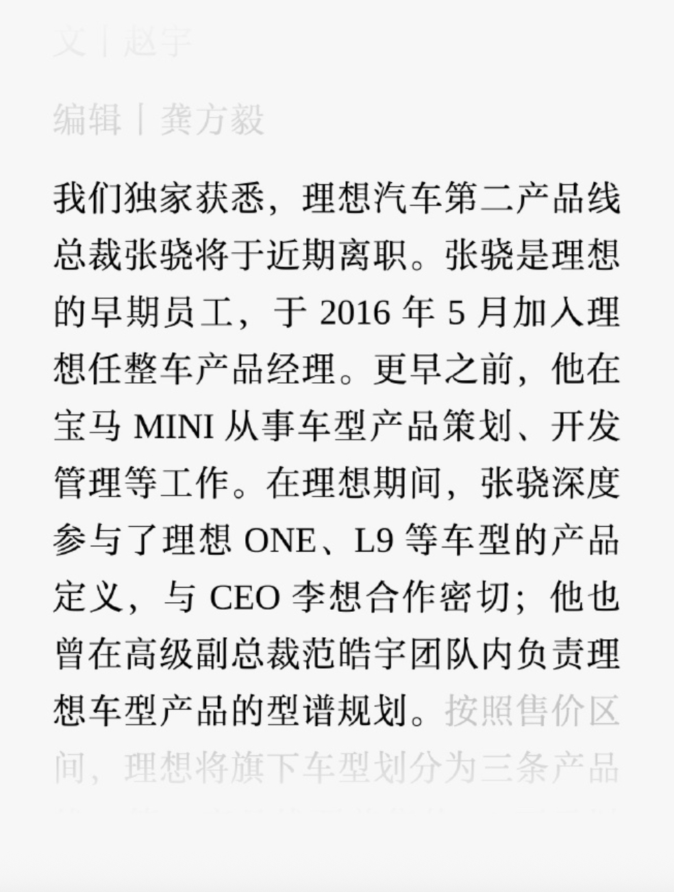 理想汽车第二产品线总裁张骁或将离职据晚点Auto报道,理想汽车第二产品线总裁张