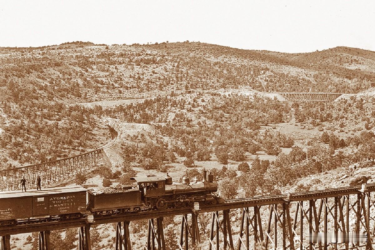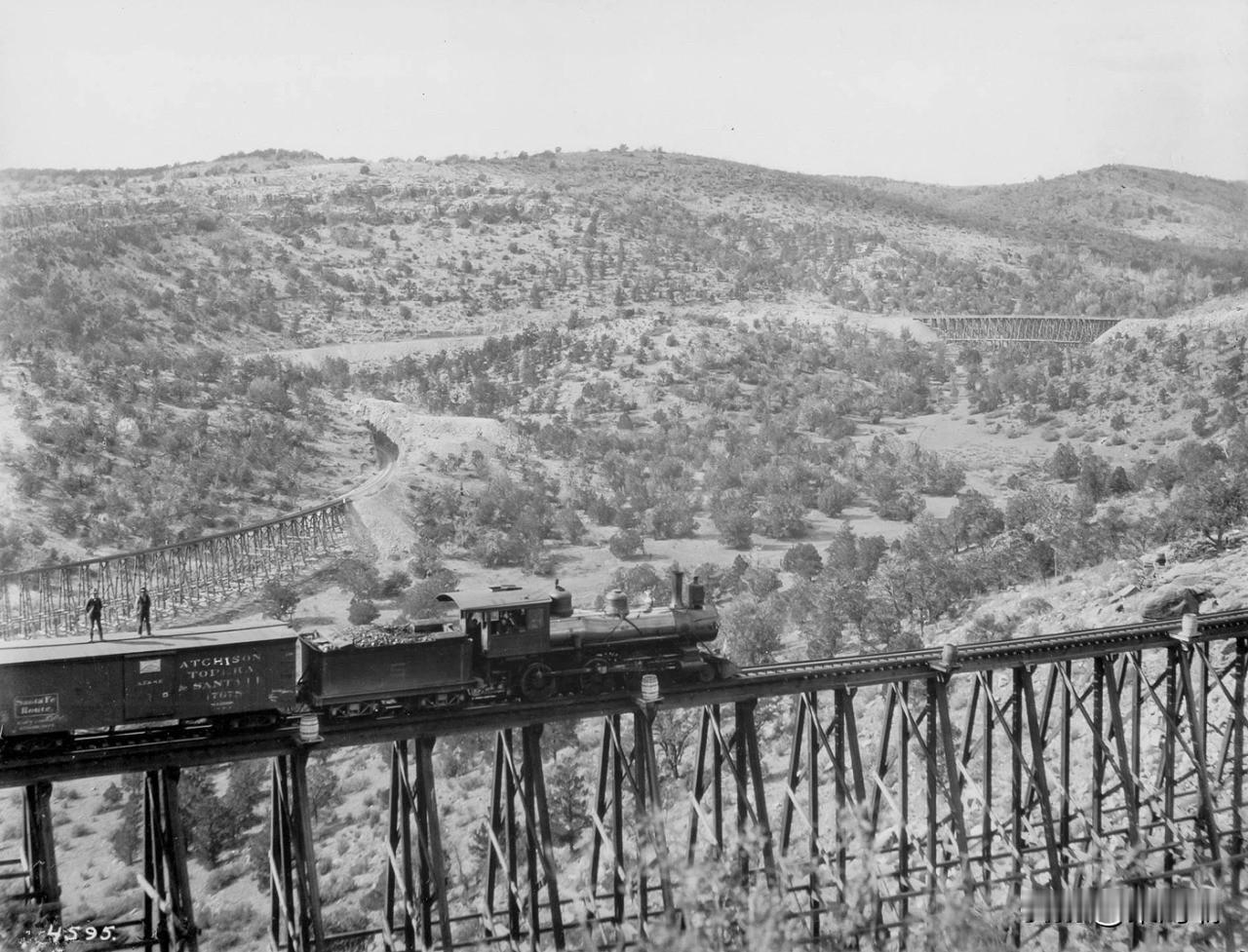 这张照片拍摄于大约 1895 年,展示了阿奇森、托皮卡和圣达菲铁路 (Atchison, Topeka and Santa Fe Railway) 的一列货运列车穿越美国亚利桑那州(Arizona)的一座高大木制栈桥。