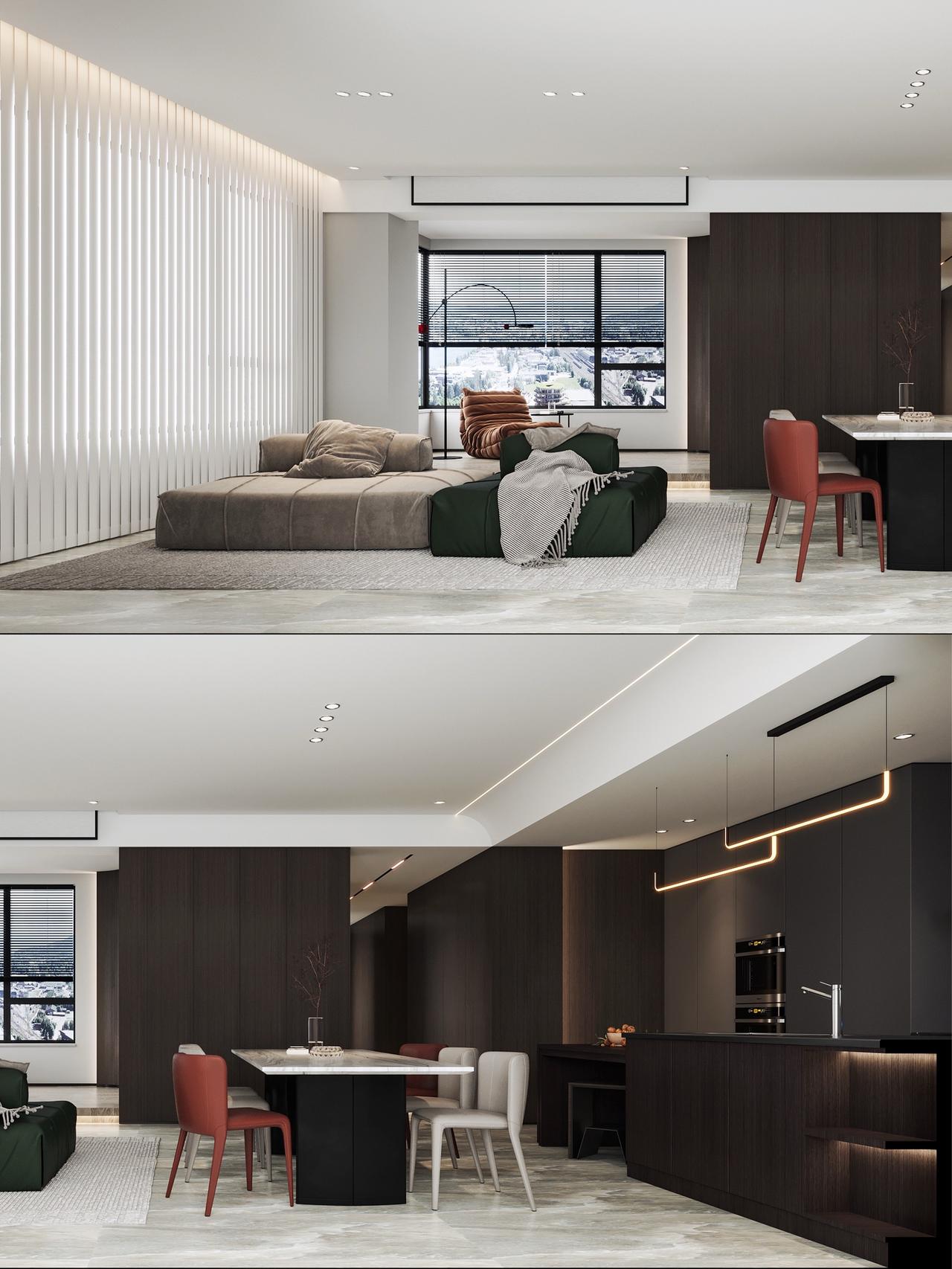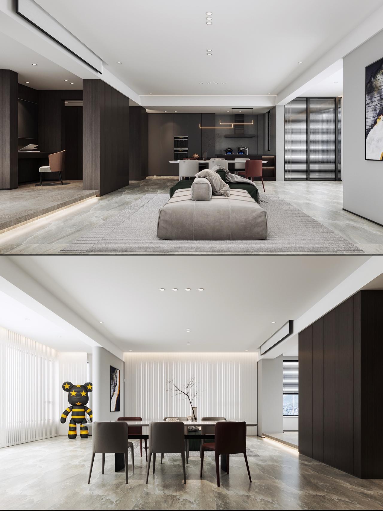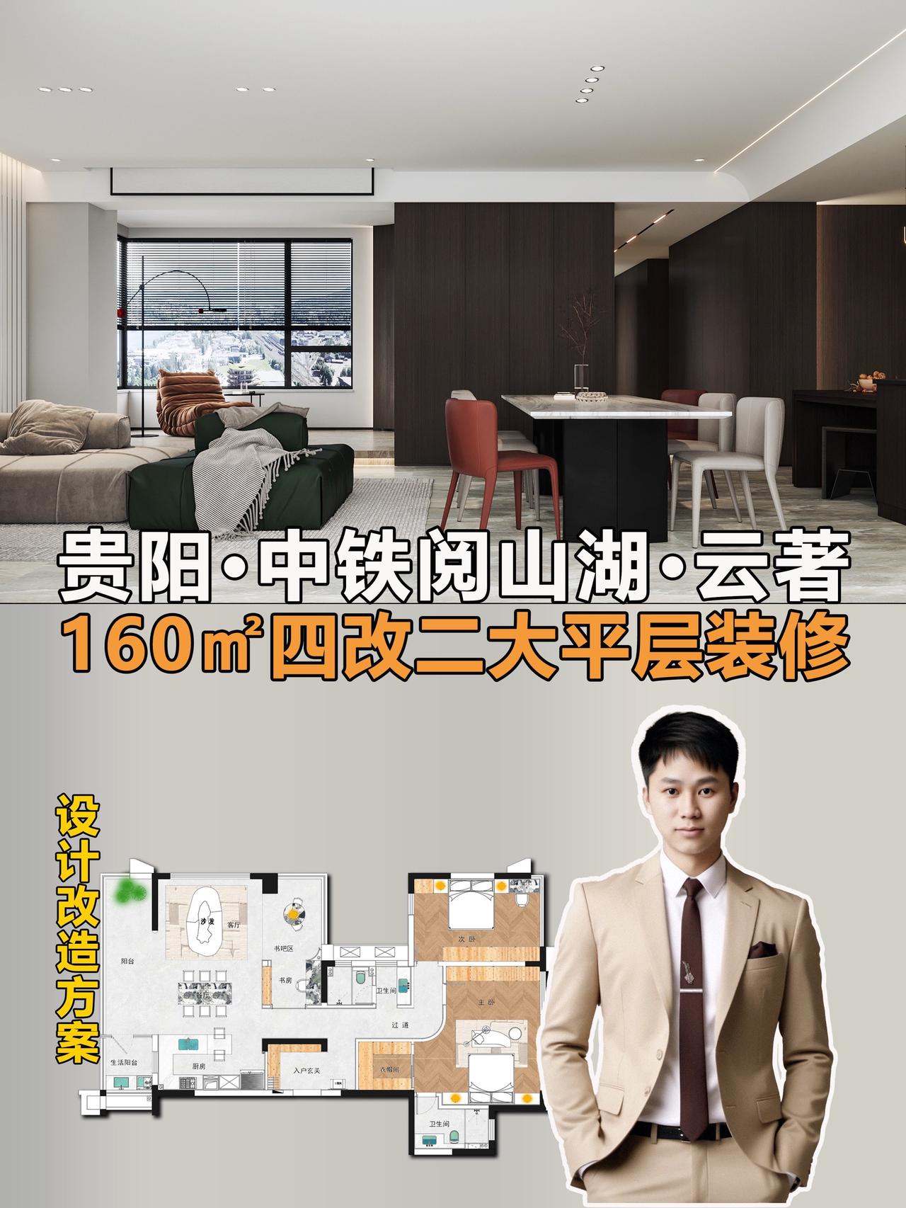 Hello👋 朋友们🧑🤝🧑 接上期分享,今天又给大家带来中铁阅山湖云著160㎡大平层户型装修设计案例❗️ 项目信息📋 📍楼盘:中铁阅山湖云著 🏠户型:大平层 📏面积:160㎡ 🎨风格:现代黑白灰风格 🏠【原始户型分析】 ①4室2厅1厨3卫+双阳台 ②改善型大平层户型 ③南北通透,三面采光 ④独立入户玄关,动静区分 ⑤270度无死角采光 📝【客情需求】 1、家庭结构:男女主人+小孩 2、仅保留2个卧室+书吧书房 3、小孩房要书桌 4、对厨房不是很满意、做开放式 5、增加储物收纳 6.单独考虑生活阳台 🎨【设计解说】 ✅以黑白灰为基底,揉入深棕木饰面与跳色软装,打造出兼具质感与温度的现代空间。空间布局上,打破传统分区壁垒,客餐厨一体化设计让动线更流畅 ✅入户设计独立玄关门厅,廊道内退,利用深色柜体与线性灯光勾勒层次,延伸视觉纵深感。主卧次卧互换,取消中间卧室。公区通铺大理石纹理瓷砖,与深咖木饰面形成材质碰撞,极简吊顶搭配无主灯设计,见光不见灯的效果让顶面更简洁。 ✅软装是点睛之笔,焦糖色单人椅、酒红色餐椅与墨绿沙发软包,在黑白灰的冷调中注入暖感;卧室则回归静谧,深木色背景墙搭配简约床品,次卧融入书桌一体化设计,兼顾实用与美学。 👉【关于我】 一位充满热情、细心、靠谱的90后设计师。拥有别墅、洋房、跃层、大平层、普通住宅10年设计经验。为装修设计发愁的你排忧解难! ✅擅长风格 意式、新中式、现代简约、奶油风、宋式美学、中古风、法式风、现代轻奢等… 📄【个人案例】 中铁阅花溪|中铁逸都|中铁阅山湖|阅山湖云著|华润悦府|中海映山湖|茅台广场|美的林城|金融城|融创九樾府|中海印龙泉|华润九悦|龙湖天曜|龙湖湖山原著|万科鸣翠|万科麓山|铁建城|龙湖舜山府|远大美域|观山小区|建发和玺|保利公园 。。。。。。 中铁阅山湖云著 中铁阅山湖臻藏 中铁阅山湖越麓 装修设计