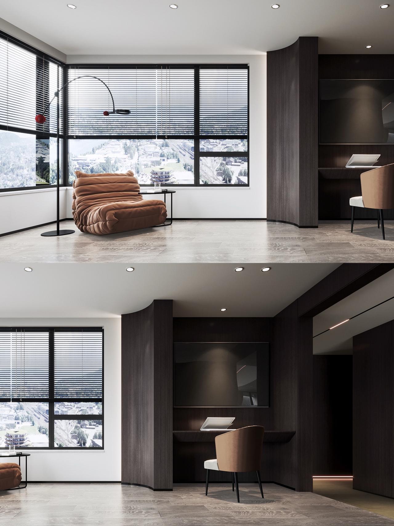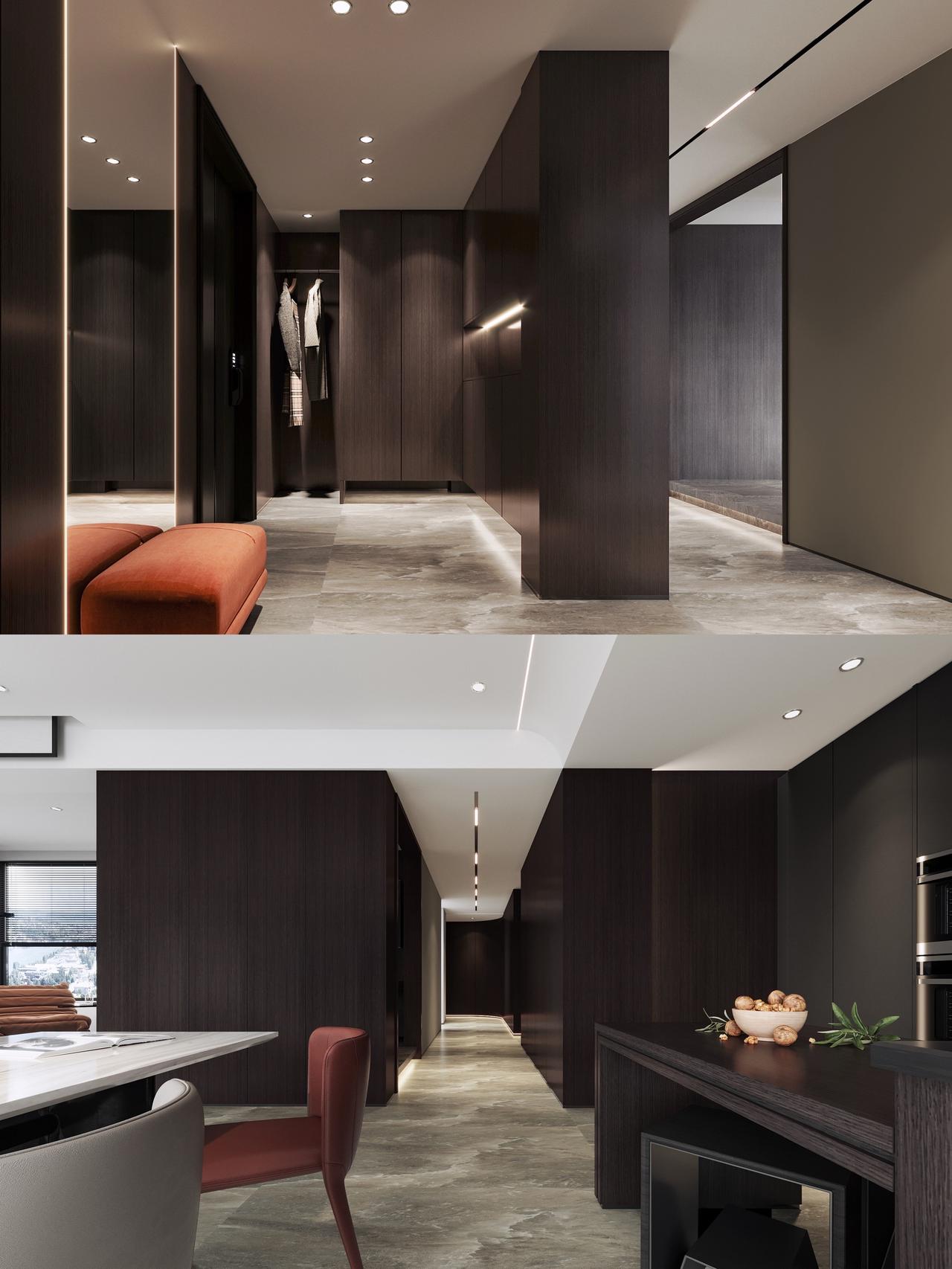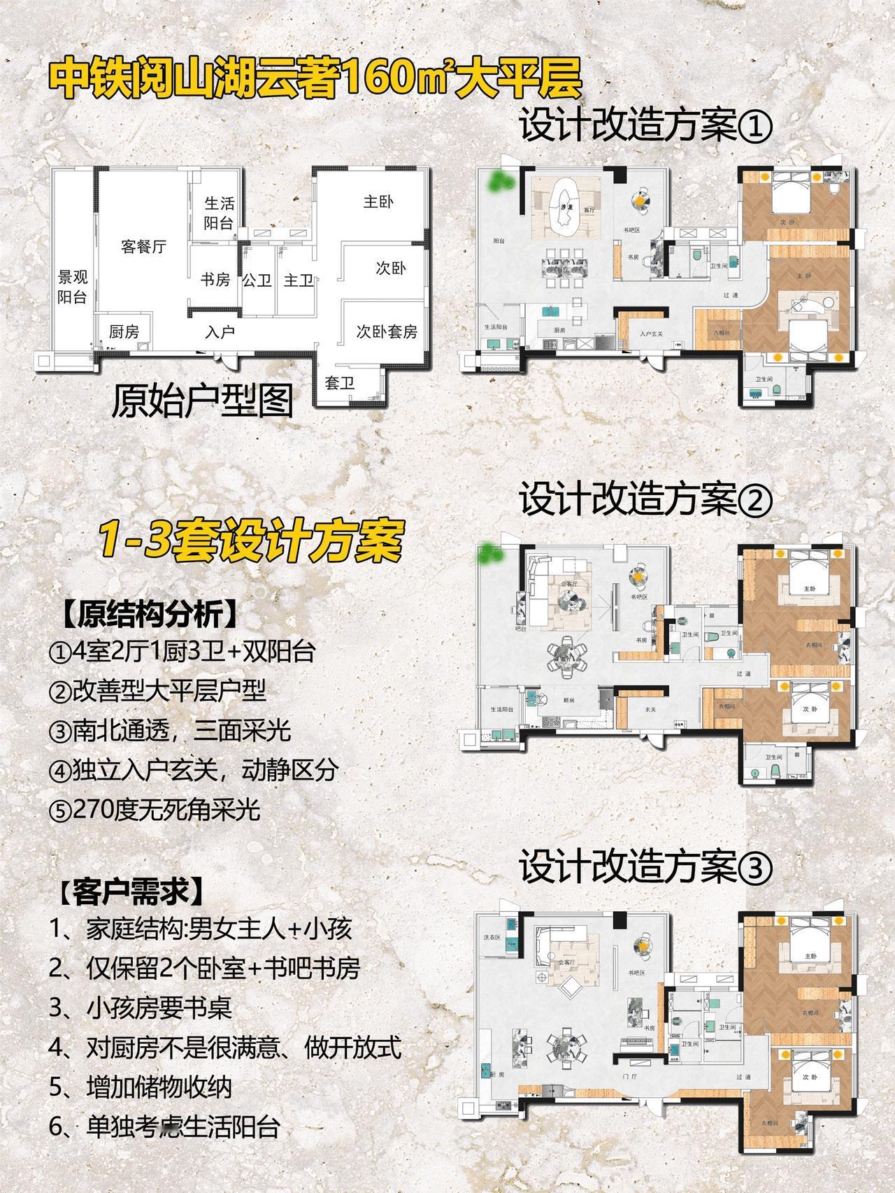 Hello👋 朋友们🧑🤝🧑 接上期分享,今天又给大家带来中铁阅山湖云著160㎡大平层户型装修设计案例❗️ 项目信息📋 📍楼盘:中铁阅山湖云著 🏠户型:大平层 📏面积:160㎡ 🎨风格:现代黑白灰风格 🏠【原始户型分析】 ①4室2厅1厨3卫+双阳台 ②改善型大平层户型 ③南北通透,三面采光 ④独立入户玄关,动静区分 ⑤270度无死角采光 📝【客情需求】 1、家庭结构:男女主人+小孩 2、仅保留2个卧室+书吧书房 3、小孩房要书桌 4、对厨房不是很满意、做开放式 5、增加储物收纳 6.单独考虑生活阳台 🎨【设计解说】 ✅以黑白灰为基底,揉入深棕木饰面与跳色软装,打造出兼具质感与温度的现代空间。空间布局上,打破传统分区壁垒,客餐厨一体化设计让动线更流畅 ✅入户设计独立玄关门厅,廊道内退,利用深色柜体与线性灯光勾勒层次,延伸视觉纵深感。主卧次卧互换,取消中间卧室。公区通铺大理石纹理瓷砖,与深咖木饰面形成材质碰撞,极简吊顶搭配无主灯设计,见光不见灯的效果让顶面更简洁。 ✅软装是点睛之笔,焦糖色单人椅、酒红色餐椅与墨绿沙发软包,在黑白灰的冷调中注入暖感;卧室则回归静谧,深木色背景墙搭配简约床品,次卧融入书桌一体化设计,兼顾实用与美学。 👉【关于我】 一位充满热情、细心、靠谱的90后设计师。拥有别墅、洋房、跃层、大平层、普通住宅10年设计经验。为装修设计发愁的你排忧解难! ✅擅长风格 意式、新中式、现代简约、奶油风、宋式美学、中古风、法式风、现代轻奢等… 📄【个人案例】 中铁阅花溪|中铁逸都|中铁阅山湖|阅山湖云著|华润悦府|中海映山湖|茅台广场|美的林城|金融城|融创九樾府|中海印龙泉|华润九悦|龙湖天曜|龙湖湖山原著|万科鸣翠|万科麓山|铁建城|龙湖舜山府|远大美域|观山小区|建发和玺|保利公园 。。。。。。 中铁阅山湖云著 中铁阅山湖臻藏 中铁阅山湖越麓 装修设计