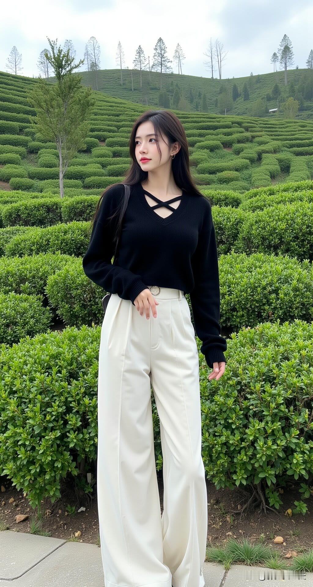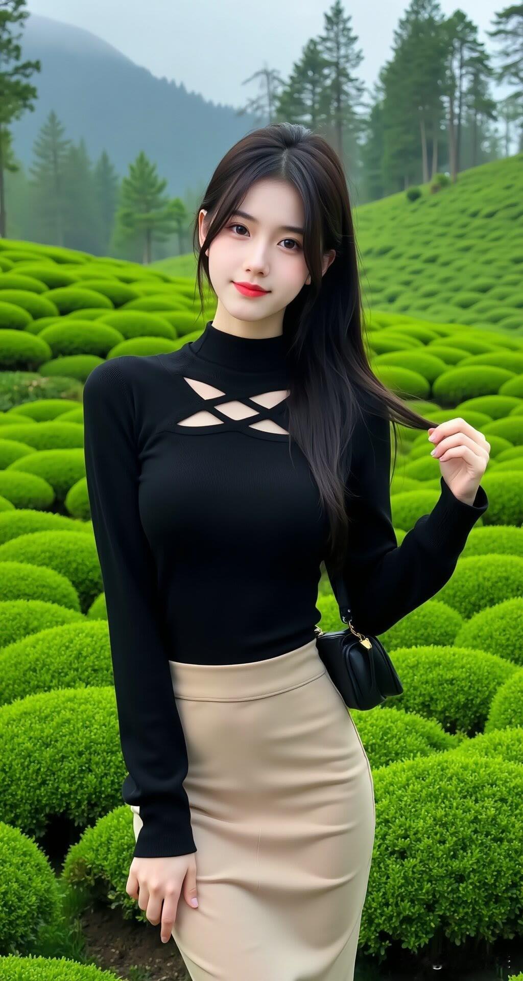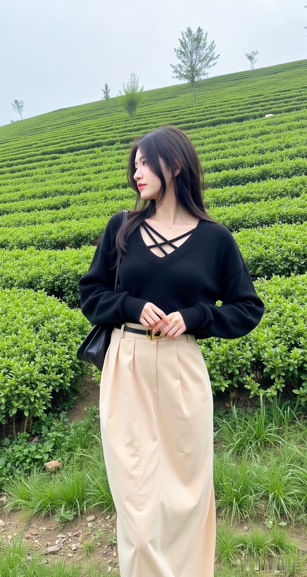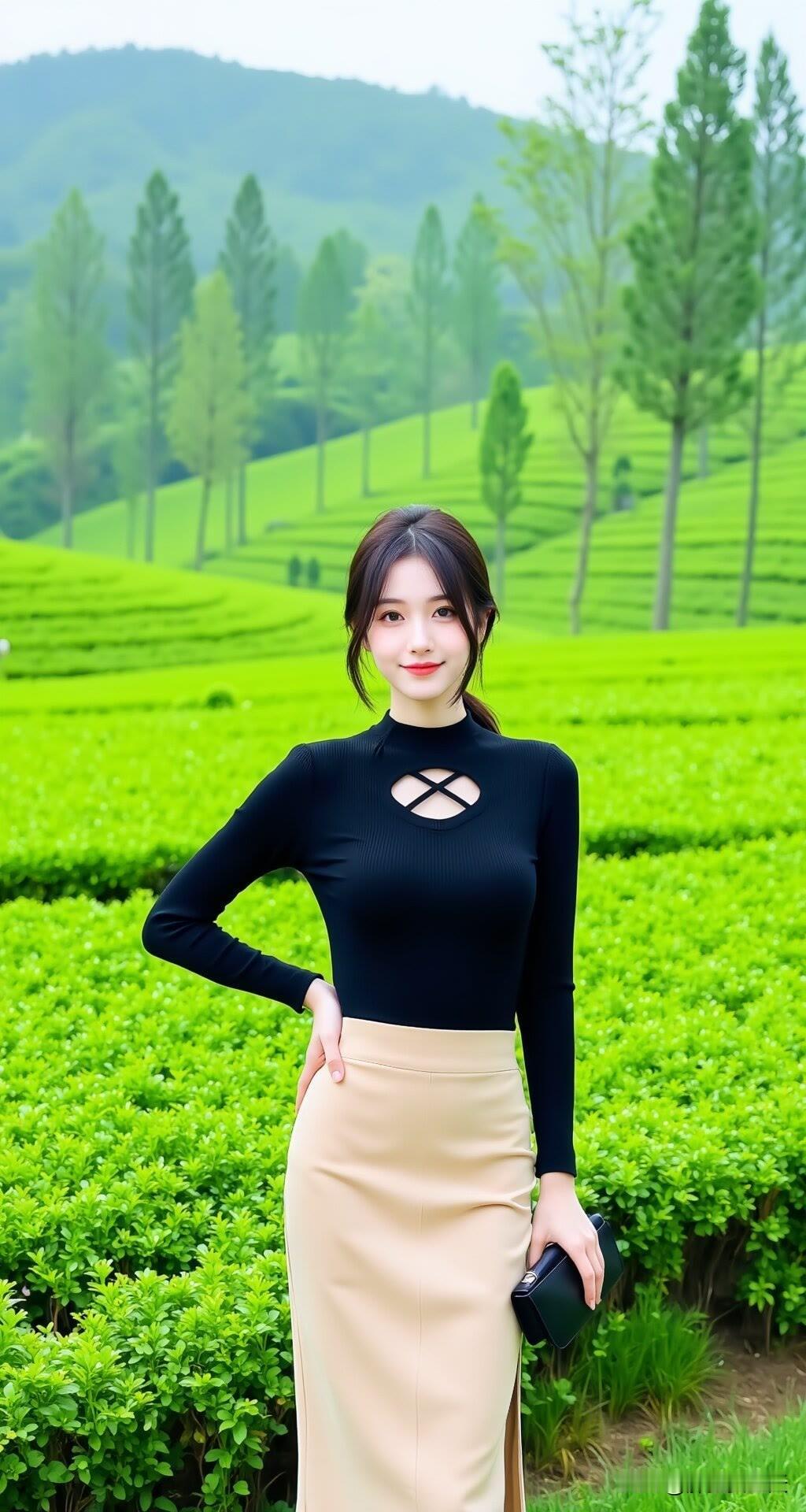 红裙于绿茶园间盛放,眸光寻向天际,似在等风,也等一场未诉的心动。