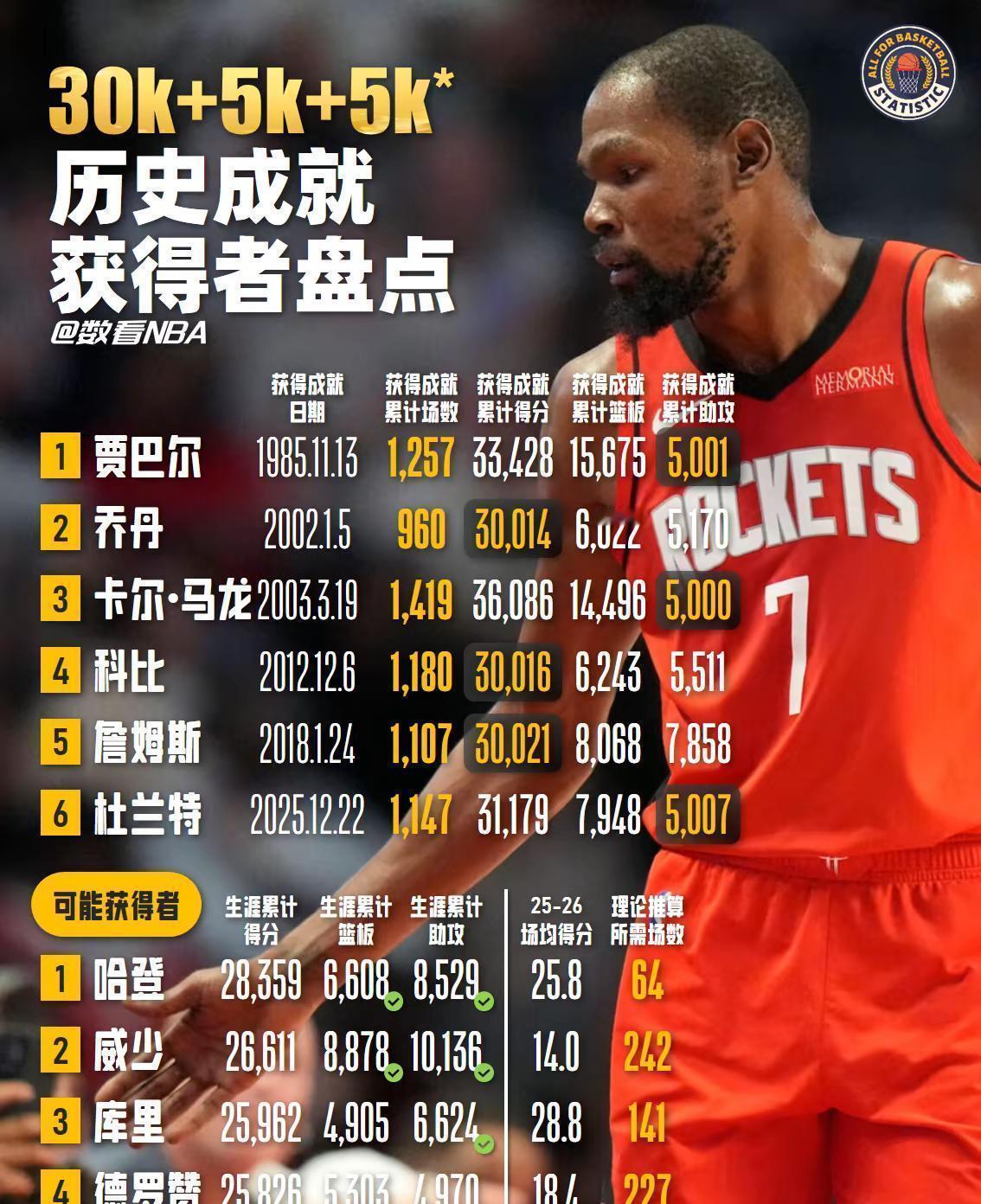 我们都被骗了十年。 杜兰特悄悄把短板焊死了。 本赛季场均5.6次助攻,生涯新高。55%的命中率砍28分,同时送出生涯最多的传球。 你看他最近三场:31分,6板,7助。 真实命中率钉在63%以上。 这不是得分手,这是指挥官。 太阳主帅沃格尔点破真相:“他正在重定义现代前锋。 ”官方数据更狠:他关键时刻的助攻率,比上赛季暴涨37%。 3万分+5千板+5千助。 历史上只有六个人做到。 另外五个名字是:詹姆斯、贾巴尔、马龙、科比、乔丹。 他用了整个职业生涯,撕掉“纯得分手”的标签。 现在,标签下露出一颗真正的领袖大脑。 别再说他只会得分了。 他正在示范,一个超级得分手如何进化成总冠军的真正大脑。