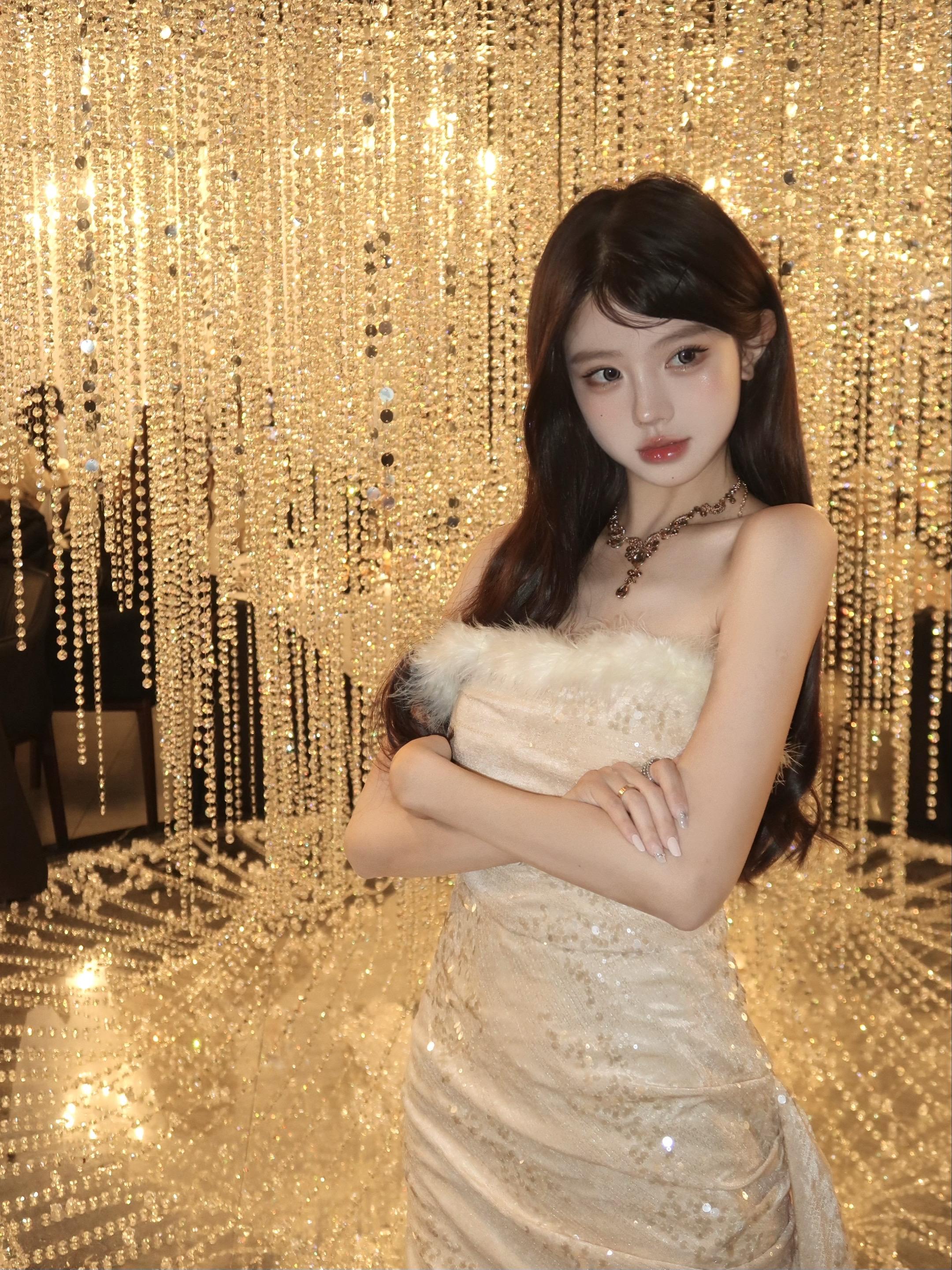 如何成为一个时尚的女孩? 香槟金缎面礼裙衬着轻奢客房,金纹腰封配长手套揉出华贵