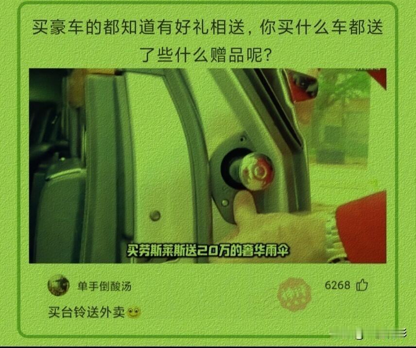 买劳斯莱斯送20万奢侈雨伞, 买台铃送什么? 外卖[捂脸][捂脸][捂脸]