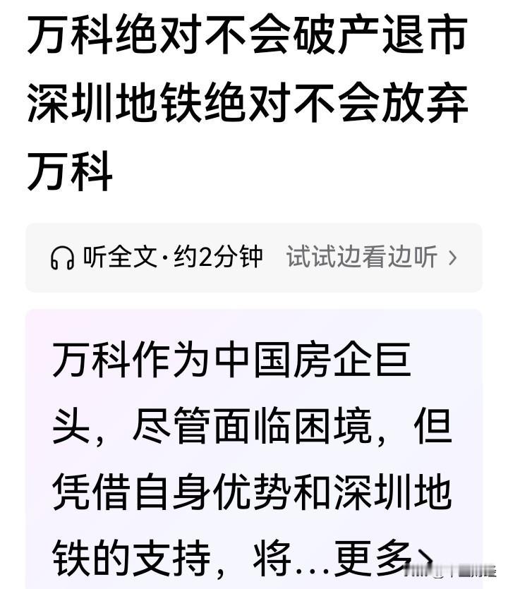 【别赌万科!】看到这样的观点,也体现了投资者对万科股票的一个坚守,或者期待吧! 然而,一家巨额亏损的公司,债务规模庞大的公司,是严格市场化还是救赎?这真的是难以准确的预测,但可以肯定的是,优胜劣汰,市场化就是市场化,投资者最好的方法是避开,即使后面能够救活,也不要盲目的去赌!