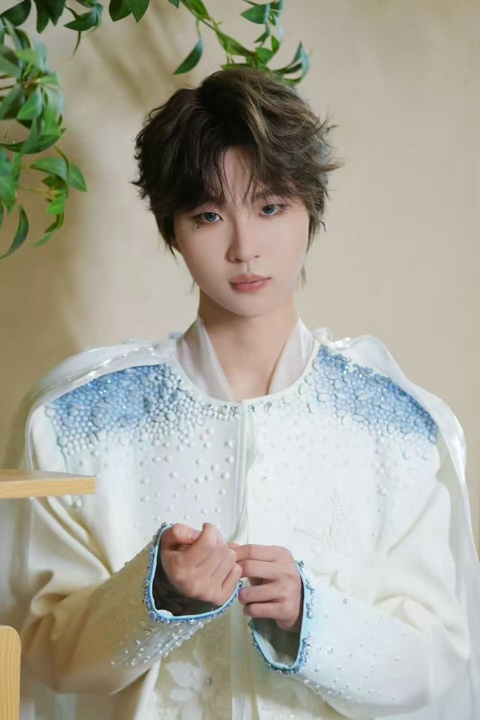 蓝白亮片缀满肩线,一步一闪像是把晴空与云絮都穿在了身上。吒宝把蓝天白云穿在身上