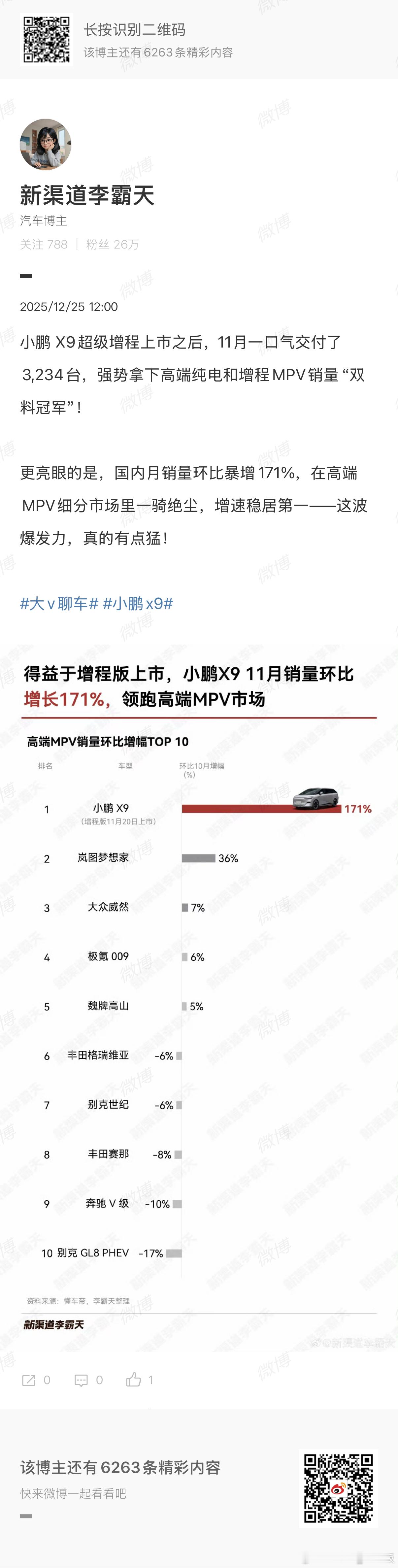 小鹏X9超级增程销量有点猛!门店“一车难求”,并且11月交付量达3234台,成功登顶高端纯电及增程MPV销量双料冠军,且国内月销量环比暴增171%,增速在高端MPV市场中位列第一。门店客流有一半都是来看小鹏X9超级增程的,并且小订转化率高达30%,而且越往北方越高。广州、哈尔滨等地门店甚至出现展车被抢购、订单数日内暴增超500%的火爆场面。小鹏X9超级增程可以说是一款“没有短板”的家用大七座,精准满足了全家出行的续航、空间、舒适需求。小鹏X9登顶11月高端纯电及增程MPV双第一11月小鹏X9销量环比增幅171%同级第一