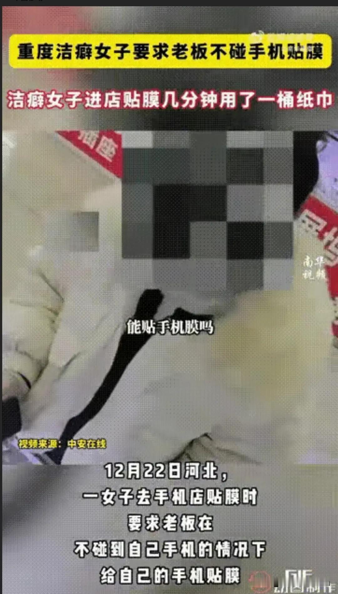 “这是病得治!”河北,一女子拿手机去店里让老板贴膜,但她提出一个要求让老板当场石化,女子问,“你能不碰我的手机给我贴膜吗?” 老板愣在原地,手里拿着贴膜工具半天没动,他干手机贴膜这行十几年,还是第一次遇到这样的要求。 贴膜本就需要用手固定手机、清洁屏幕、对齐膜的位置,不碰手机根本没法完成操作,他以为女子是在开玩笑,笑着摆手说这根本办不到,让女子有什么其他要求尽管提,只要是贴膜相关的,他都能满足。 可女子的表情格外认真,还从包里掏出一大包纸巾,开始反复擦拭自己的手机外壳,连手机边缘的缝隙都用纸巾裹着棉签擦了好几遍,嘴里还念叨着不能让别人的手碰到她的东西,碰了就会觉得不舒服。 老板看着女子的动作,才意识到她不是开玩笑,而是真的有严重的洁癖。女子擦拭手机的几分钟里,抽出来的纸巾堆在桌上快有一桶高,她擦完手机又开始擦老板的贴膜工作台,从桌面到边缘的角落,连老板放在桌上的贴膜刮板都被她用纸巾擦了三遍,老板想上前阻止,又怕惹得女子不高兴,只能站在一旁干看着,脸上满是无奈。 周围有其他来修手机的顾客,看到这一幕都围了过来,有人忍不住小声议论,说女子这洁癖也太严重了,就是贴个膜而已,没必要这么折腾,还有人直接对着女子说“这是病得治”,话语里带着明显的不解和指责。 女子听到旁人的议论,手上的动作顿了一下,却没停下擦拭的举动,只是抬头说了一句,自己就是受不了别人碰她的东西,哪怕是不小心碰到一下,心里都会膈应好几天,晚上连觉都睡不好。老板这才注意到,女子的额头渗着细汗,看得出来她不是故意刁难,而是真的被洁癖的问题困扰着。 老板心里的无奈慢慢变成了一丝同情,他想了想,跟女子商量,说可以全程戴着一次性手套操作,所有接触手机的工具都用酒精消毒,保证不会让手直接碰到她的手机,女子犹豫了好一会儿,才点了点头同意这个方案。 老板赶紧拿出一次性手套戴上,又用酒精棉片把贴膜用的刮板、擦屏布、除尘贴都仔细擦了一遍,连装膜的盒子都消了毒,这才示意女子可以把手机递过来。女子却还是不放心,自己拿着手机,只把屏幕对着老板,让老板用工具隔着纸巾托着手机边缘,全程不许老板的手碰到手机背面和侧面。 贴膜的过程变得格外繁琐,老板需要一边小心翼翼地用工具固定膜的位置,一边听着女子的指挥调整角度,稍微动一下就会被女子提醒“别碰到我的手机”,原本三分钟就能完成的贴膜,硬生生折腾了二十多分钟才结束。 结束后女子又拿出纸巾,把手机从屏幕到背面擦了个遍,这才满意地收起来,付钱的时候还特意把钱放在纸巾上,让老板用夹子夹起来,不要用手直接碰。 老板收下钱后,看着桌上堆成小山的纸巾,长长地舒了一口气,他跟周围的顾客说,干了这么多年生意,第一次遇到这么特殊的顾客,虽然过程折腾,但也能理解女子的难处,毕竟没人愿意被洁癖困扰。 有顾客听完老板的话,也收起了之前的指责,说原来女子不是故意找茬,只是身体的本能反应,换成谁被这样的问题困扰,日子都不会好过。 其实洁癖看似是“爱干净”的极端表现,本质上却可能和心理因素相关,长期的焦虑、压力或是过往的经历,都可能让人产生过度的清洁执念。 旁人看到这样的行为,第一反应往往是觉得对方“矫情”“奇怪”,甚至用“这是病得治”这样的话去指责,却忽略了当事人内心的痛苦和挣扎。 就像这位贴膜的女子,她也不想因为洁癖折腾自己和别人,可身体的本能反应根本不受控制,她需要的不是旁人的指责,而是多一点理解和包容。 生活里总有一些看似难以理解的行为,背后往往藏着不为人知的困扰。面对和自己不同的人和事,与其急着评判和指责,不如多一份耐心去了解背后的原因,这份包容,不仅能让他人感受到温暖,也能让人与人之间的相处多一份和谐。 各位读者你们怎么看?欢迎在评论区讨论。