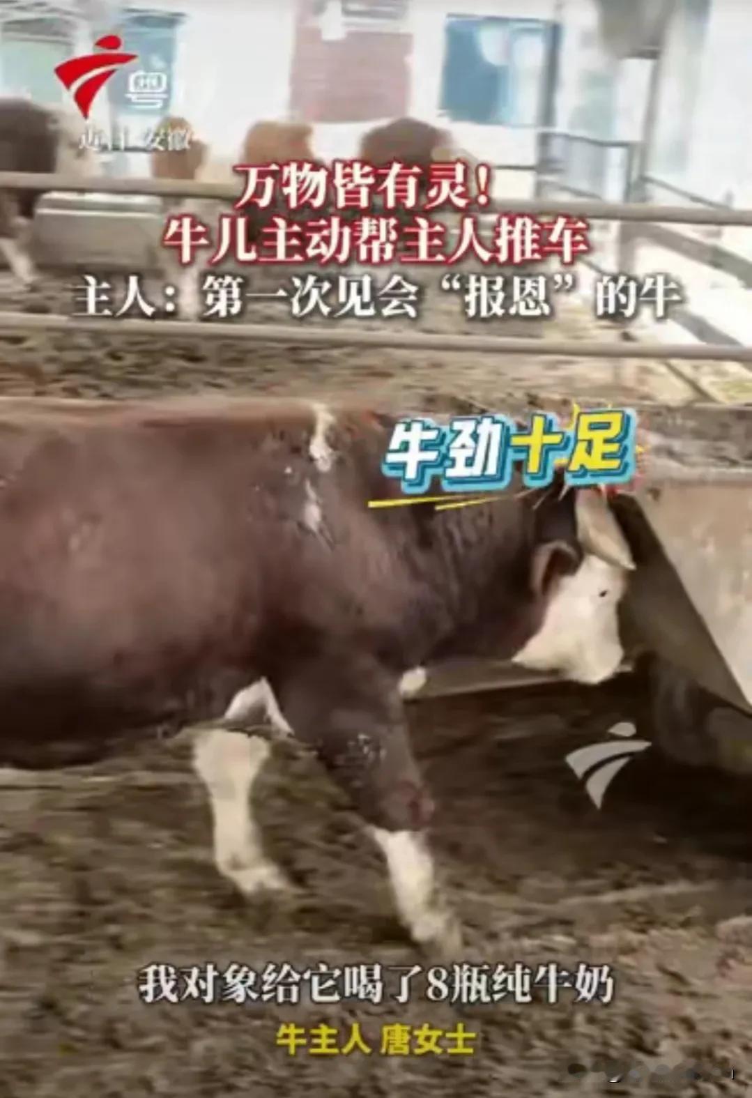 万物皆有灵!安徽,有一头牛之前因主人救过它一命,从此以后,牛主人只要一开门,它就会帮忙干活。主人说:养了7年的牛,第一次见这么懂事的,网友说:它是报恩牛,就别卖它了吧! 这位牛主人是唐女士,她和这头牛的缘分早就超越了普通的饲养关系。当初这头牛突然出现身体不适的状况,不吃不喝还一直蜷缩在角落,唐女士发现后立刻放下手里的活计查看,找了懂行的人来看,才知道牛是因为肠胃问题引发了虚弱,要是再耽搁下去,情况只会越来越糟。 唐女士没舍得让牛就这么熬着,不仅跑了好几趟去买对症的药,还听人说纯牛奶能帮着补充营养,就特意买了8瓶纯牛奶一点点喂给牛喝。那些天里,唐女士每天都守在牛的身边,按时喂药喂水,连自家的农活都先放了放,就怕错过牛的任何一点好转迹象。 牛在她的照料下慢慢恢复了精神,从一开始连抬头的力气都没有,到后来能慢慢站起来吃饲料,这个过程里,唐女士的每一份用心,这头牛都用自己的方式记在了心里。 牛康复之后没几天,唐女士推着饲料车准备去喂其他牲畜,刚打开牛圈的门,就看见这头牛慢悠悠走到车边,用头轻轻抵着车帮往前推。 唐女士当时愣在原地,她养了7年牛,从没见过哪头牛能做出这样的举动,一开始还以为是牛偶然的动作,可接下来的日子里,只要她一开门准备干活,这头牛就会主动凑过来,用头或者身体帮忙推东西,动作算不上多利落,却透着一股认真劲儿。 唐女士试着赶它回去休息,它却只是晃了晃脑袋,依旧坚持跟在旁边搭把手,次数多了,唐女士也就由着它的心意,心里却被这头牲畜的举动暖得发烫。 她从来没把这头牛当成单纯的家畜,7年的朝夕相处,看着它从一头小牛犊长成壮实的大牛,早就有了家人般的情分,网友说让她别卖这头牛的建议,其实根本用不着提醒,她打从一开始就没动过把牛卖掉的念头。 唐女士和这头牛的故事被分享出来后,不少人都感慨动物的灵性,却很少有人注意到,这份灵性的背后,是唐女士毫无保留的付出。 农村里养牛,大多是为了帮衬农活,可唐女士对这头牛,却多了份细致的关怀,牛饿了她会及时添料,牛病了她会尽心医治,哪怕只是牛偶尔蹭蹭她的手,她也会笑着拍拍牛的脑袋。 正是这份平等的对待和真诚的关怀,才让这头牛放下了对人的戒备,用自己力所能及的方式回应着主人的好。牲畜不会说话,却能通过最直接的行为表达情感,它们的回应或许简单,却比任何语言都来得真切。 人与动物之间的联结,从来都不是单方面的索取,而是双向的奔赴。唐女士用真心对待自家的牛,换来了牛的“报恩”,这样的故事看似偶然,实则是世间所有生命相处的本质——你给予的善意,终究会以不同的方式回到你身边。 这头牛的举动,让人们看到了动物身上最纯粹的情感,也让更多人明白,哪怕是对待牲畜,多一份耐心和温柔,就能收获意想不到的温暖。 各位读者你们怎么看?欢迎在评论区讨论。
