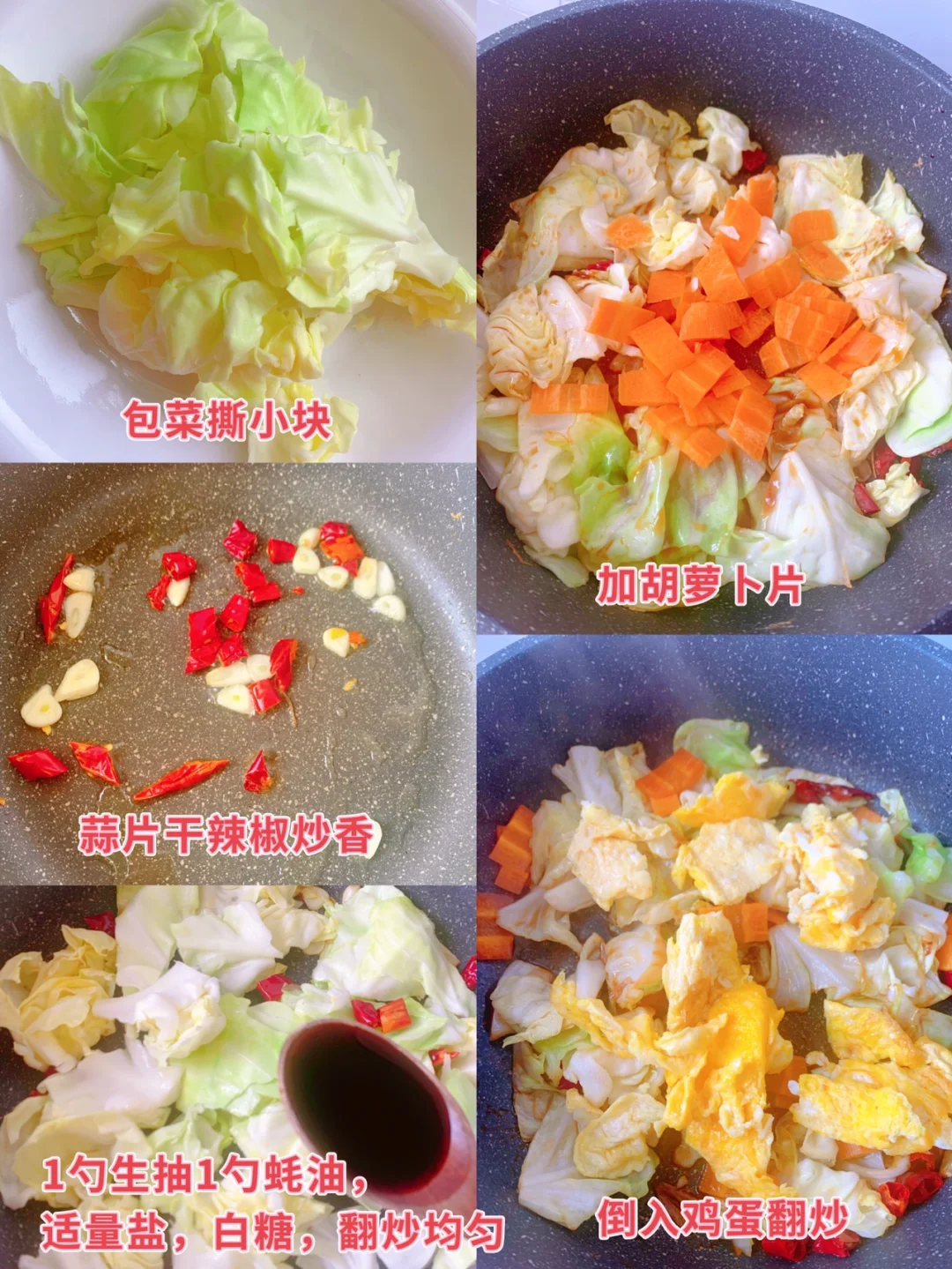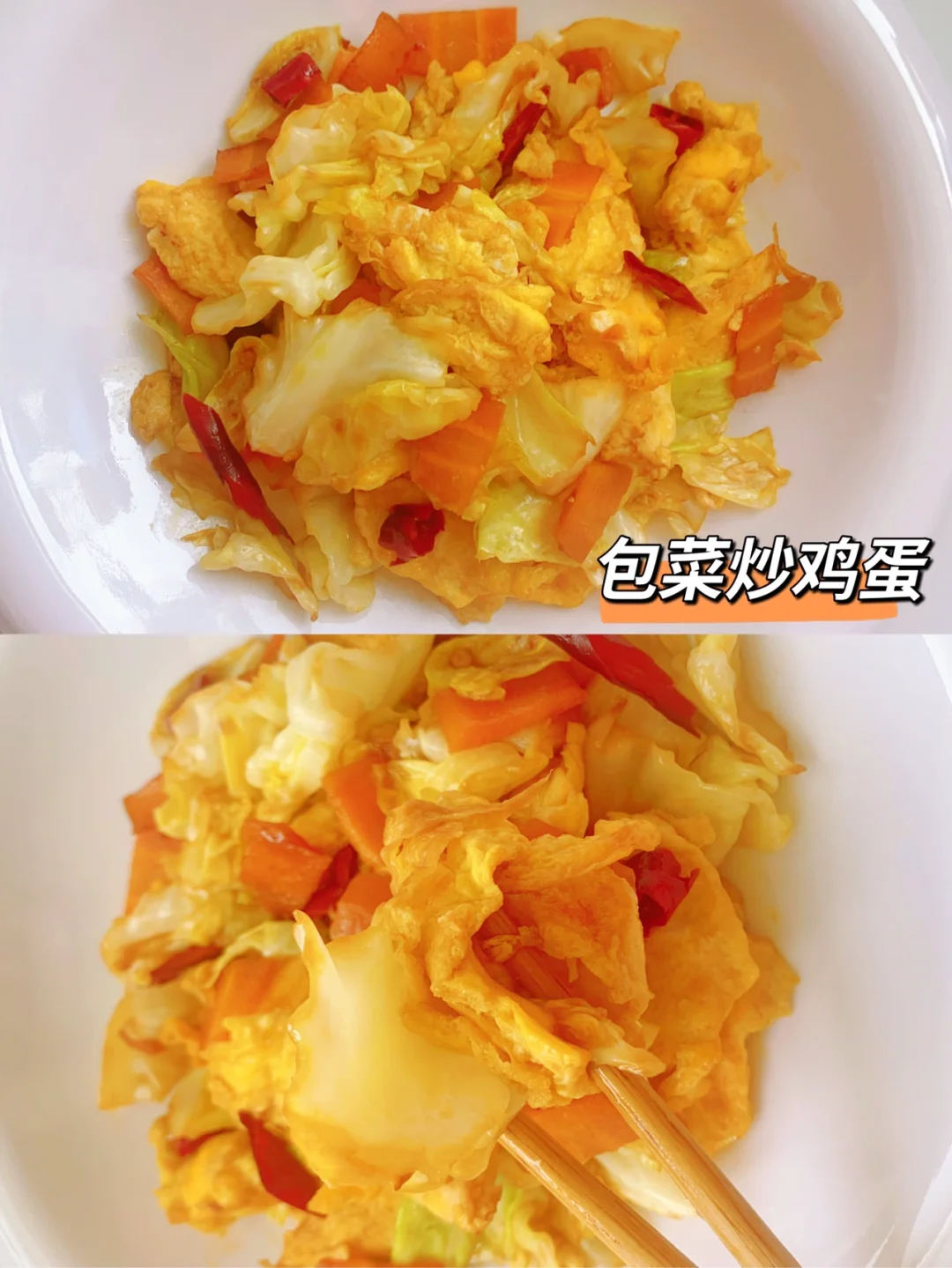 📝做法:荷包蛋煎熟盛出,包菜撕小块备用,蒜片辣椒爆香,倒入包菜,一勺生抽,一勺蚝油,适量盐,白糖翻炒均匀加入胡萝卜片倒入鸡蛋炒熟即🉑~