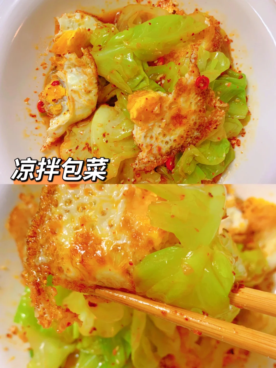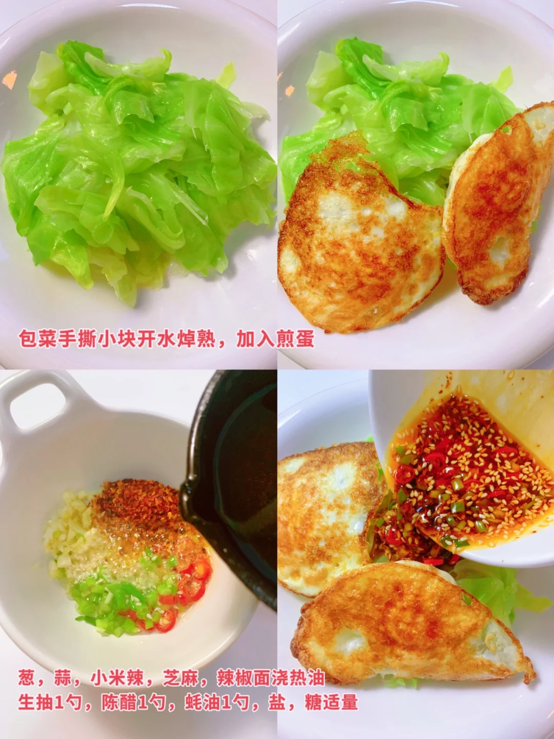 📝做法:煎两个荷包蛋盛出,包菜撕小块,开水焯熟盛出,加入煎蛋,倒入酱汁拌匀。(酱汁配料见图片)
