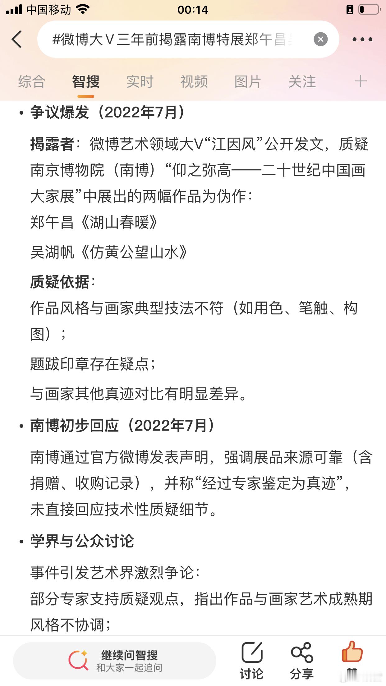 微博大V三年前揭露南博特展郑午昌吴湖帆两幅伪作原来,揭露是揭露了(图1),南京博物院当年回应了,不是贾宝玉,是真的。(图2) 吴湖帆与庞莱臣并称“南庞北张”,其“梅景书屋”收藏与鉴定标准被视为业界标杆。他与钱镜塘并称“鉴定双璧”,曾为大量珍品题签,张大千评其“甚服我心”。 2025年12月,南京博物院2022年"历代山水画特展"中展出的郑午昌与吴湖帆作品被重新质疑为伪作。微博用户"涨了叫我哈"早在2022年展览期间便指出展品笔触粗糙、风格雷同,疑为"低仿品掉包原作"。事件近期发酵后,南京博物院回应称展品为真迹,但舆论仍呼吁彻查馆藏体系漏洞。该争议与同期曝光的"江南春拍卖伪作案"交织,暴露文博系统鉴定机制风险。