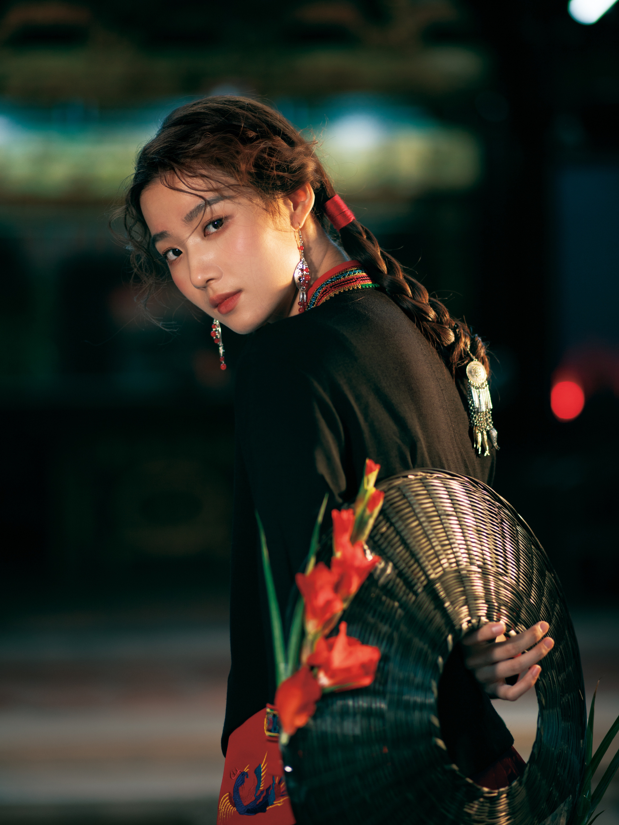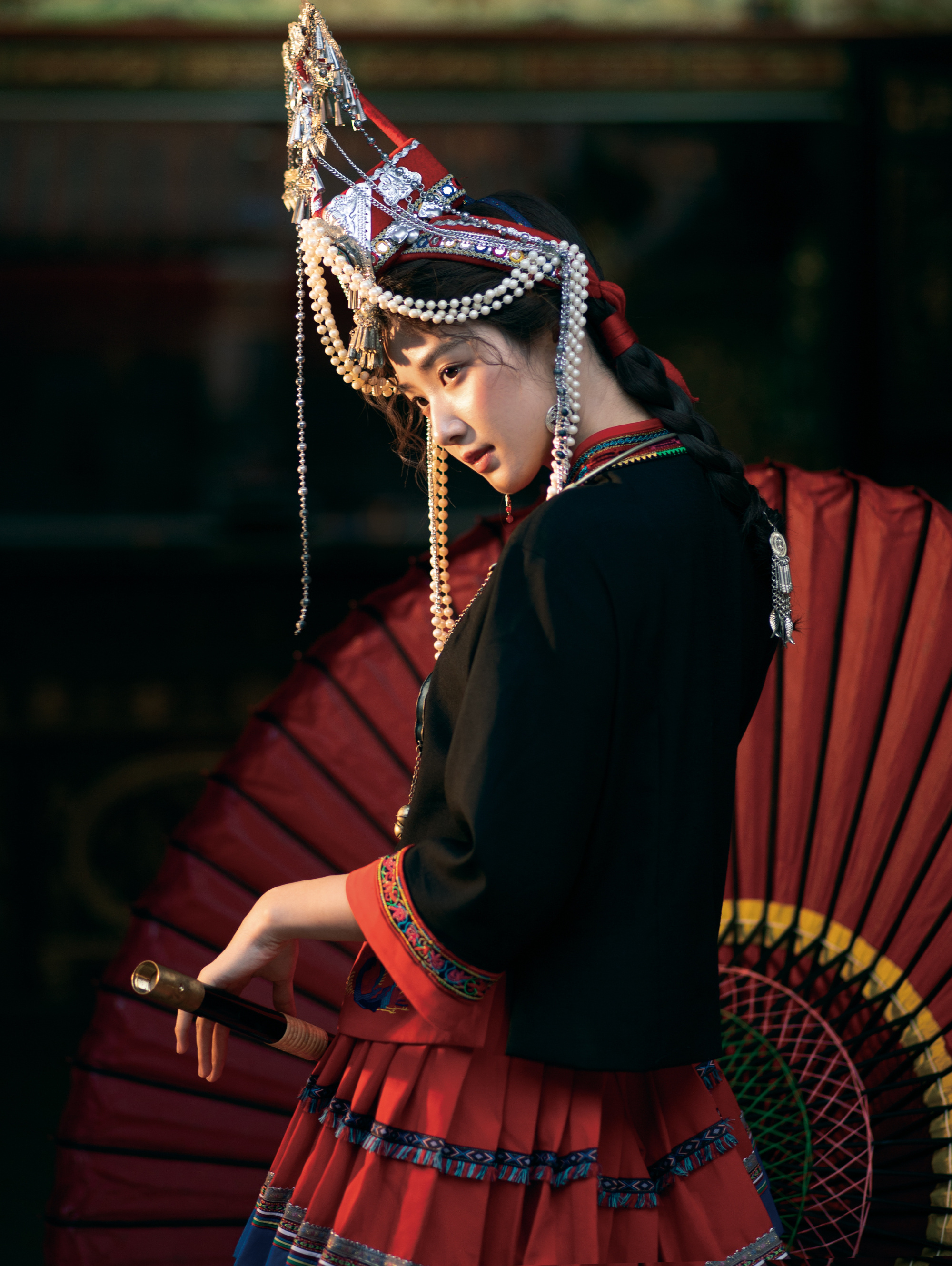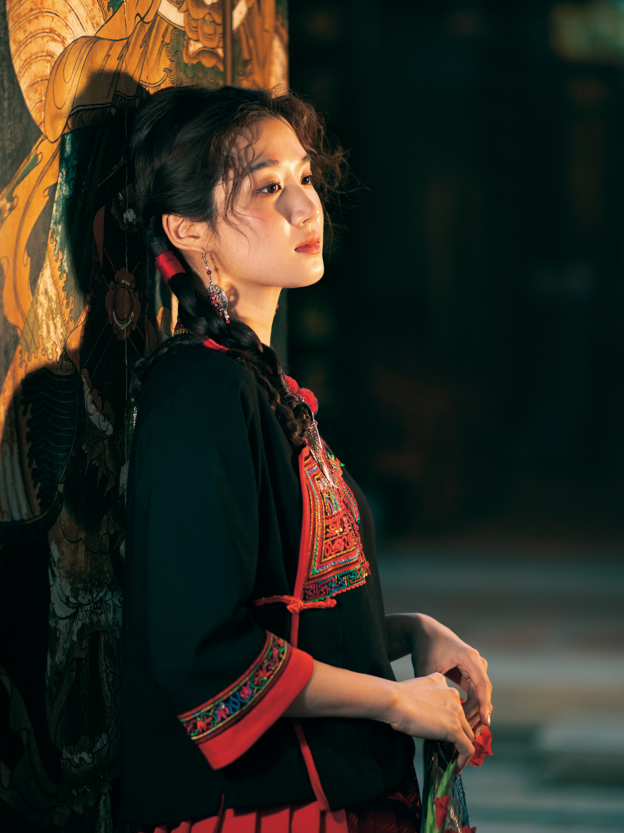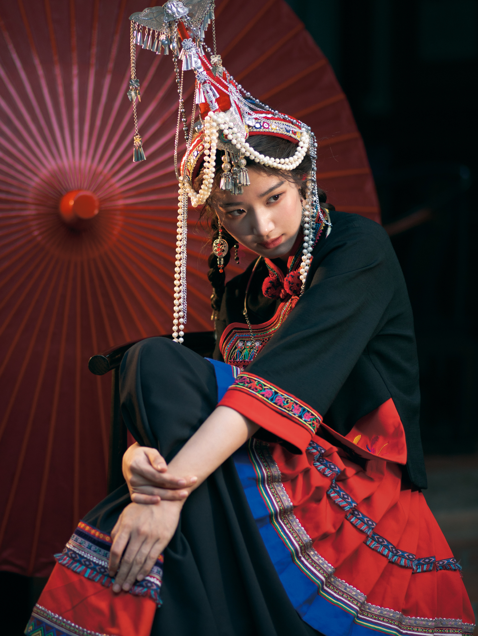卢昱晓畲族服饰写真 在重峦叠嶂的纹样里,循着迁徙的山路与星辰。噜噜晓古韵十足。卢昱晓畲族造型 好有画面感。卢昱晓