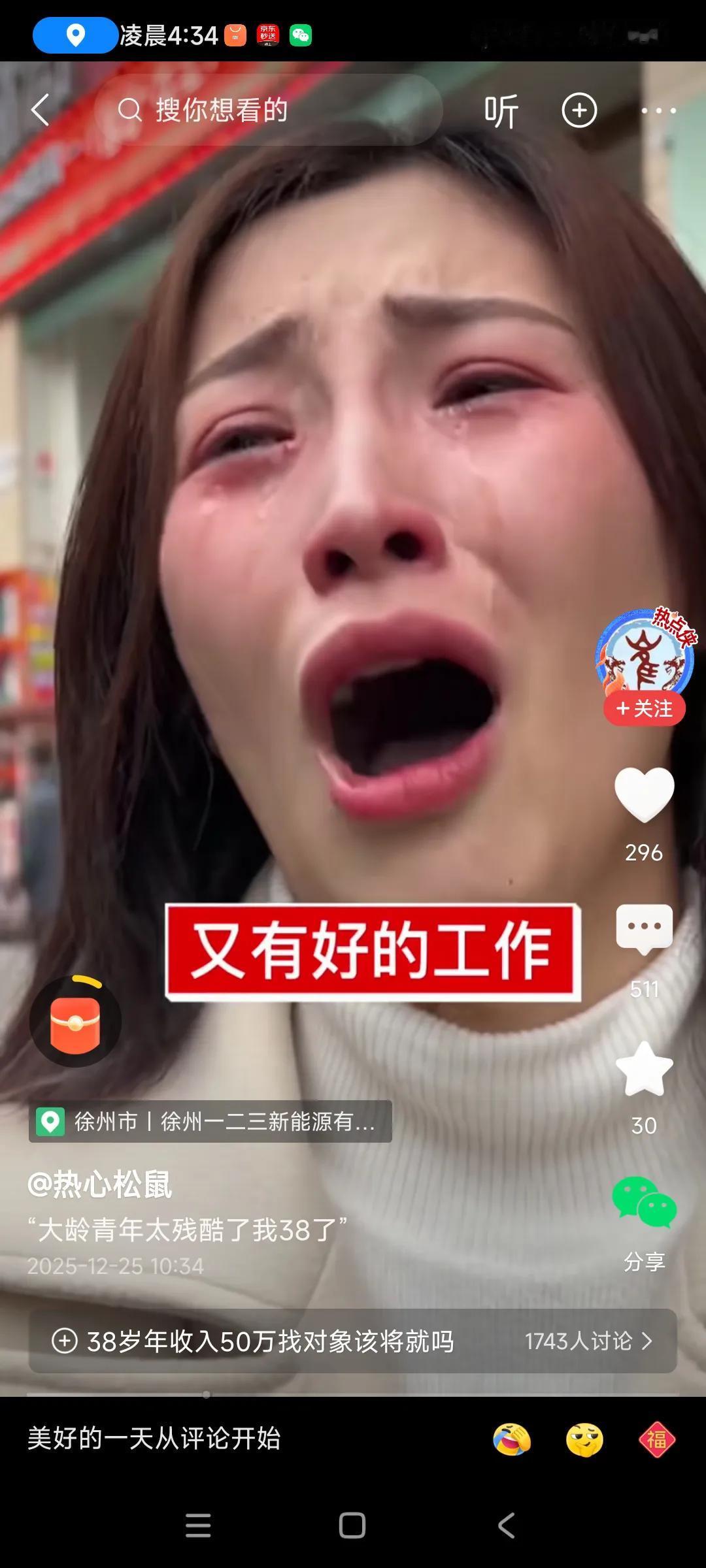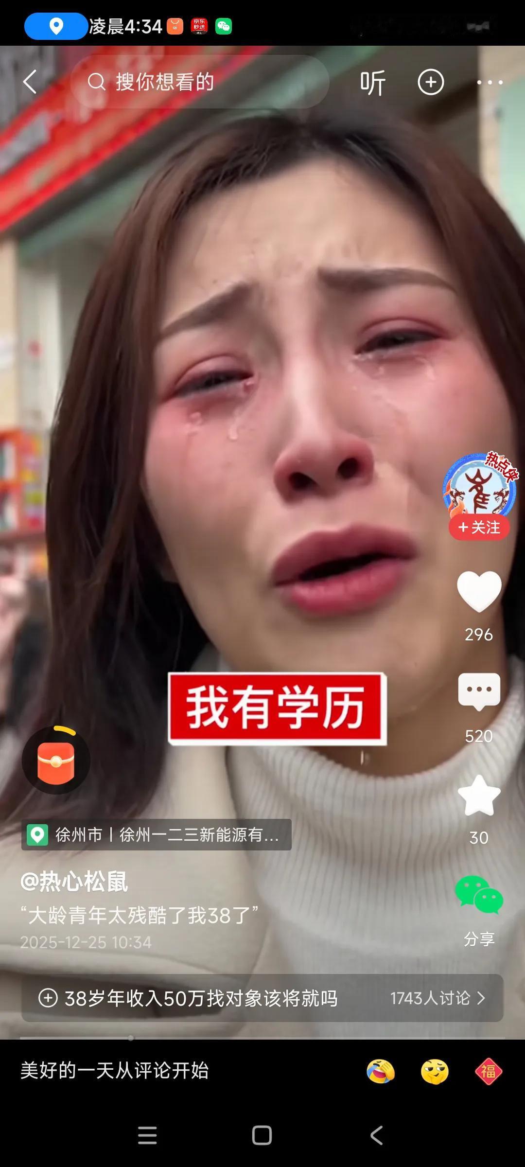 38岁未婚女孩泪流满面,她只想找一个和她条件差不多的对象,为何这么难啊,,, 她有高学历, 她有好工作, 她有高收入, 却忘了她要找的优质男生,条件很好的,早就结婚了,,孩子都会打酱油了,,[捂脸][捂脸][捂脸] 剩下的不少男光棍,基本上条件不好,学历差,挣钱不多的,,,[捂脸][捂脸][捂脸]
