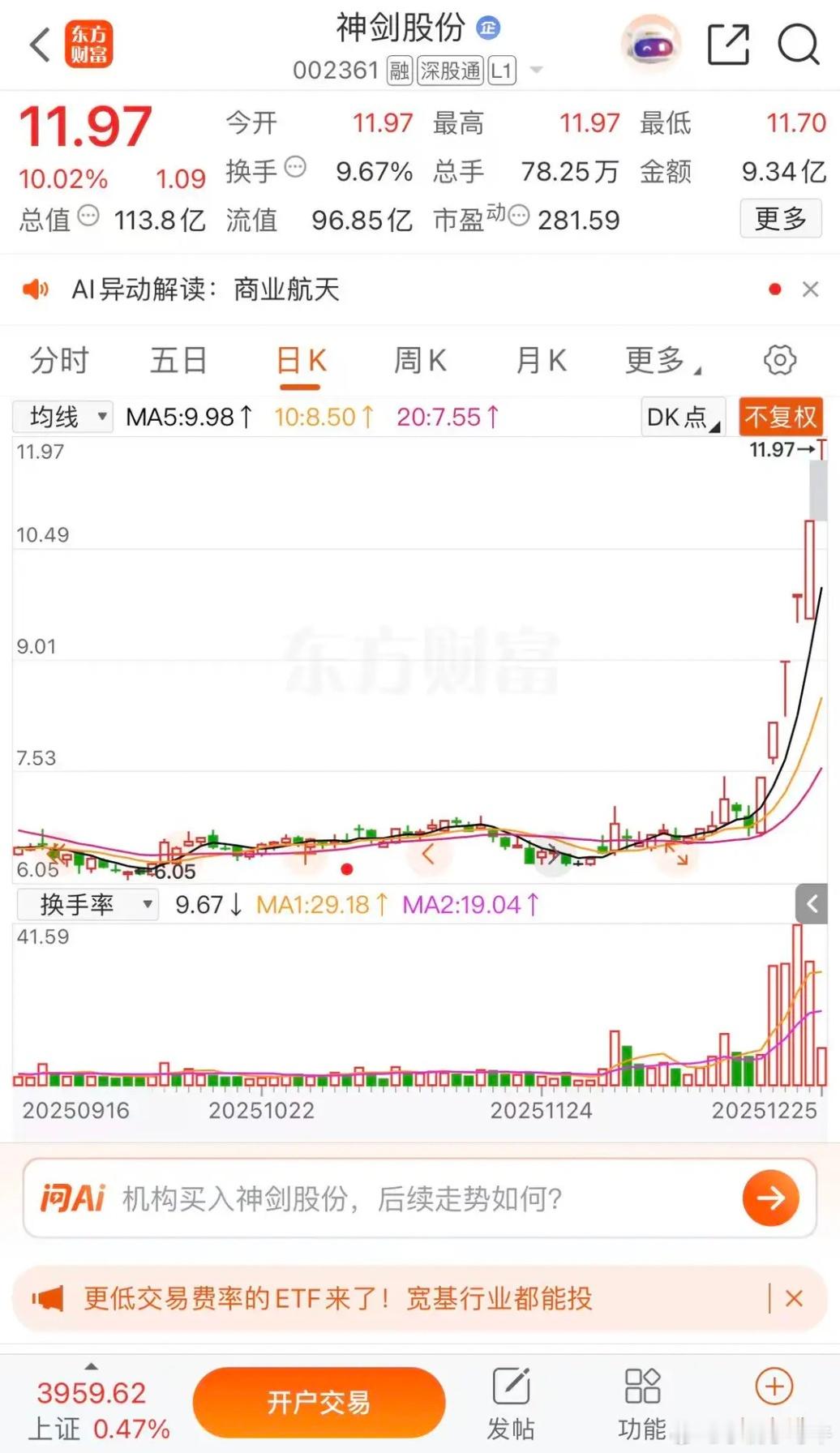 中国卫星突破百元突破千亿市值有望,商业航天造就妖股神剑股份中国卫星涨停收盘报收72.73元每股,成交金额102.4亿元,总市值达到860亿元,千亿市值有望冲击,百元股有望,这次要突破15年牛市的最高价81.90元每股。神剑股份涨停收盘报收11.97元每股,成交金额9.34亿元,达到6连板涨停。商业航天造就好多妖股,西部材料,航天发展,航天电子,航天动力等牛市模式开启指数又要冲击4000点。