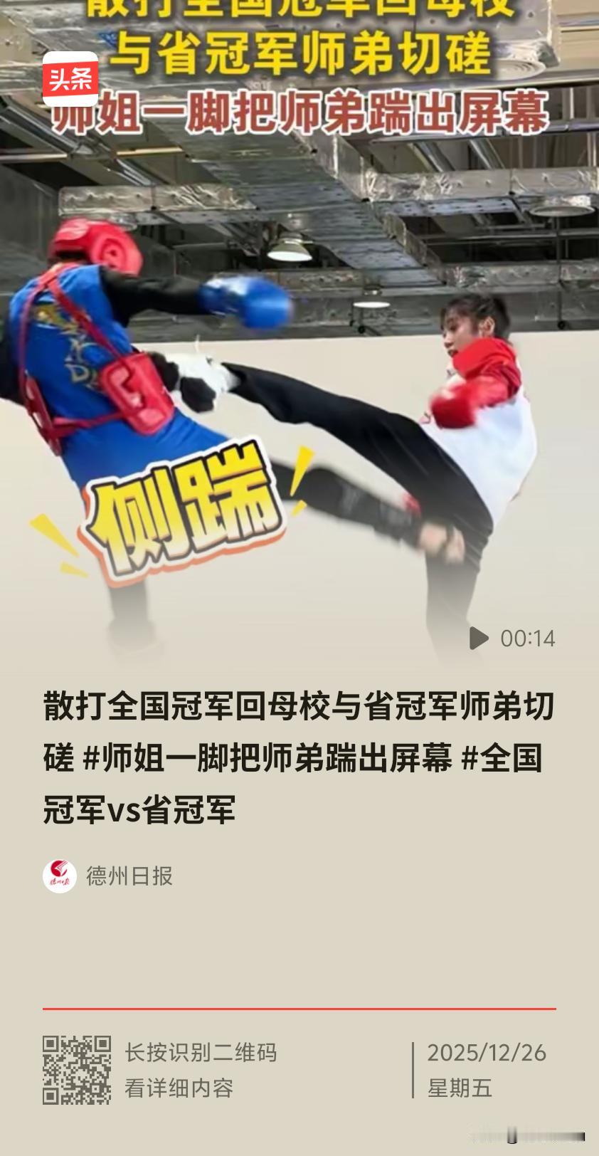 请你明确一下具体需求,比如围绕“散打全国冠军回母校与省冠军师弟切磋”这件事进行事件后续的合理想象、写一篇新闻稿、评价这件事等,以便我更为精准地为你提供服务。不过我可以先简单分析一下这件事可能带来的影响: 对师弟的影响 ● 提升实战能力:全国冠军在技术、经验和心理素质上往往更胜一筹。与全国冠军切磋,省冠军师弟能在实战中发现自己技术上的短板和不足,学习到更高级的攻防技巧和战术运用,从而提升自己的实战水平。 ● 增强自信心和斗志:与高水平的对手过招,如果师弟能在切磋中发挥出自己的实力,甚至取得一定的成绩,会极大地增强他的自信心。同时,也会激发他进一步提升自己的斗志,为追求更高的目标而努力训练。 对学校的影响 ● 营造良好体育氛围:这样的交流活动会在学校内引起广泛关注,激发更多学生对散打的兴趣和热情,营造出积极向上的体育氛围,促进学校体育文化的发展。 ● 提升学校知名度:全国冠军回到母校与省冠军师弟切磋,这一事件本身具有一定的新闻价值。如果通过媒体报道,能够提升学校在体育领域的知名度,吸引更多优秀的体育人才报考该校。 对散打运动的影响 ● 促进技术交流和传承:两位冠军的切磋是一次高水平的技术交流,他们在切磋过程中所展现出的技术和战术,对于其他散打爱好者和从业者来说是一次很好的学习机会,有助于散打技术的传承和发展。 ● 推动散打运动发展:这样的活动能够吸引更多人关注散打运动,提高散打运动的社会影响力,为散打运动的推广和普及起到积极的推动作用。