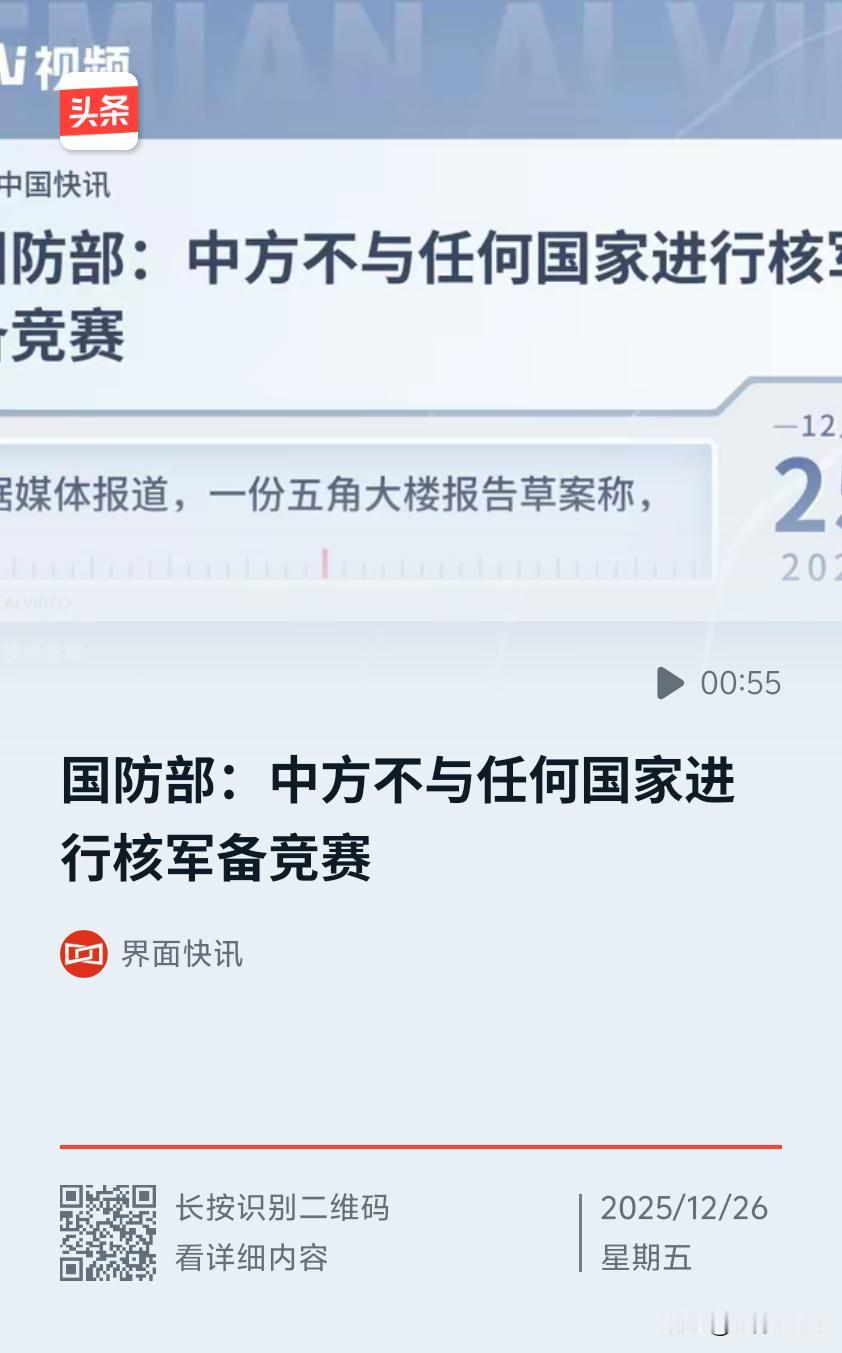 近期国防部发言人张晓刚及外交部发言人林剑等中方代表都强调中方不与任何国家进行核军备竞赛。 美国拥有最大核武库,奉行首先使用核武器的核威慑政策,长期投入巨资升级“三位一体”核力量,甚至宣称重启核试验,却反过来炒作所谓“中国核威胁”,为自身加速扩充核力量找借口。 而中方始终恪守不首先使用核武器政策,坚定奉行自卫防御核战略,始终将自身核力量维持在国家安全需要的最低水平。《新时代的中国军控、裁军与防扩散》白皮书也强调,中国在核武器的规模和发展方面始终采取极为克制的态度,从不与其他国家比投入、比数量、比规模,今后也不会与任何国家搞核军备竞赛。中国在核武器国家中核试验次数最少,还关停部分核武器研制生产设施。 中方敦促美方切实履行核裁军特殊优先责任,进一步大幅实质性削减核武库,停止破坏全球战略稳定的行径。同时中方一直积极参与《不扩散核武器条约》审议进程和五核国机制会议,就核军控问题同各方保持对话。