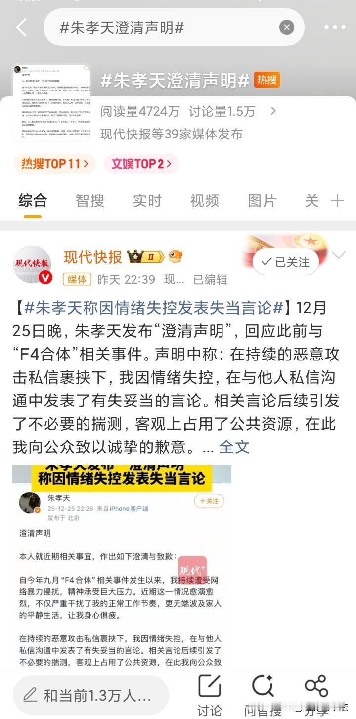 朱孝天的账号和澄清声明,直接搜都搜不到了,个人主页也只能通过特定的方法才能找到,他原帖的转发内容也不能公开了。 怎么会变成这个样子,有人说是他开了一键防护故意让大家搜不到,有人说是他的话太离谱,是号都要没的前奏; F4合不合体都不是什么大事,这年景不会有多少人还在意什么青春情怀,感觉就是有人利用这个契机想毁掉朱孝天的事业,原因和目的大家大致都能猜到,你觉得呢?