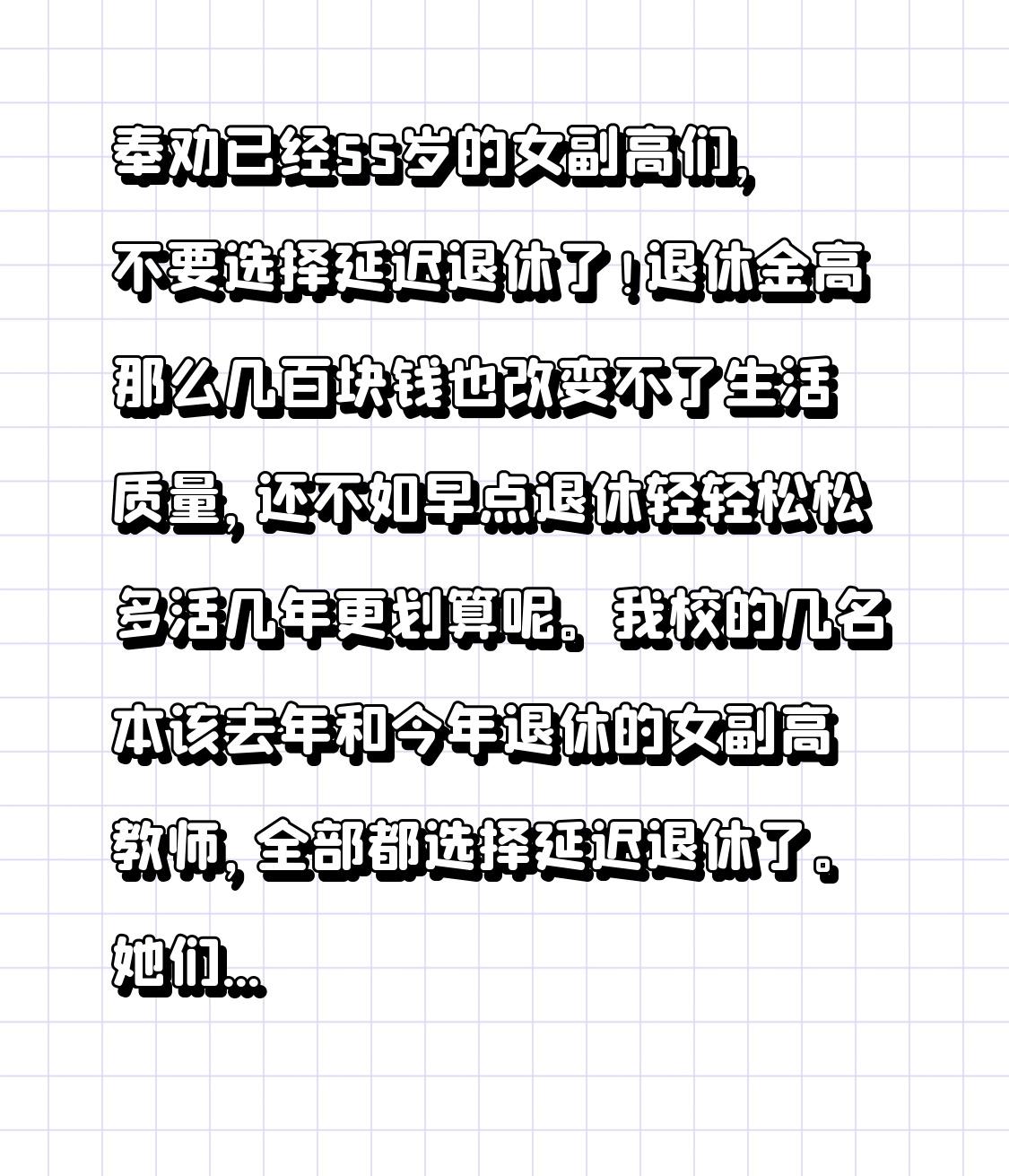 已经55岁的女副高们,尽量不要选择延迟退休了!退休金高那么几百块钱也改变不了生活