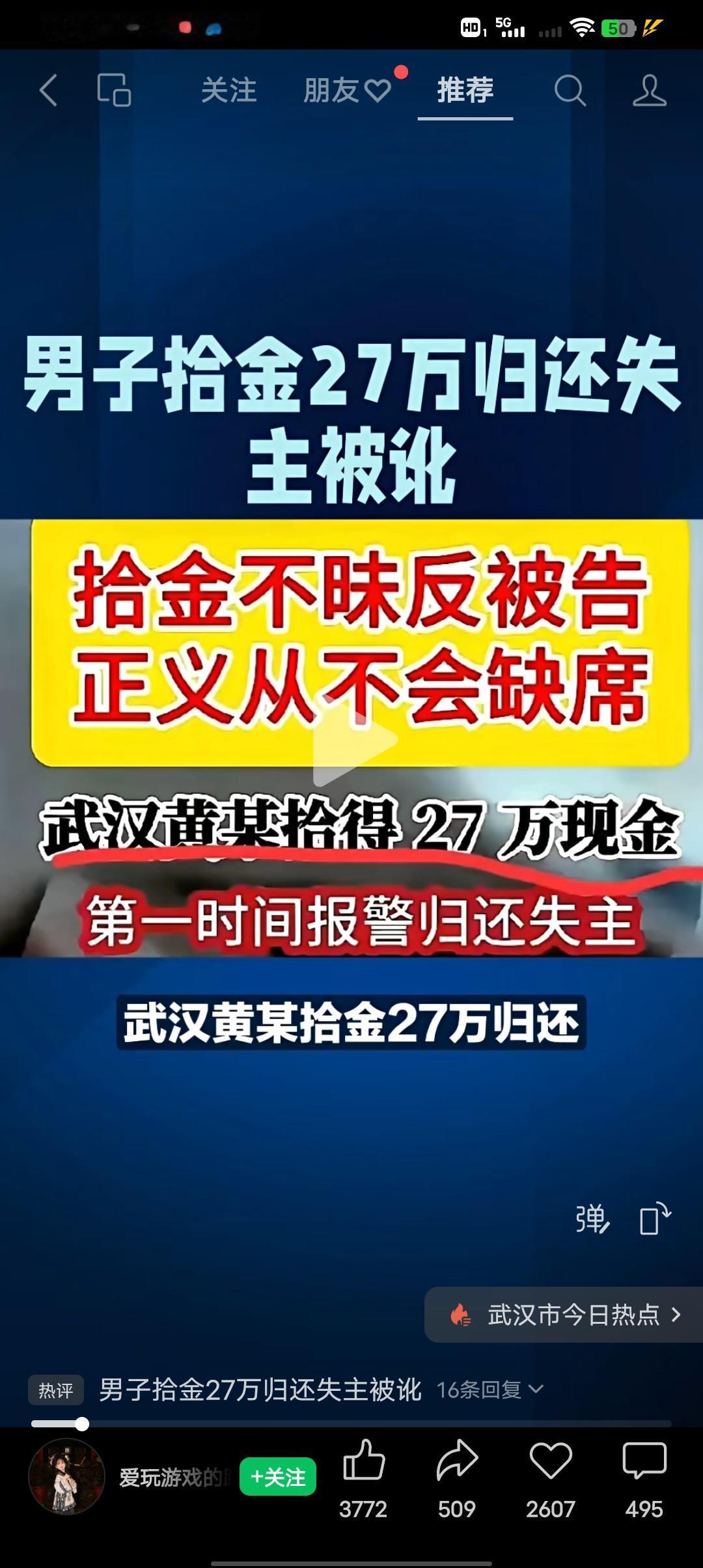 拾金不昧反被告,正义从不缺席! 武汉黄某拾现金27万,并第一时间报警归还失主,而失主却讹称自己丢了32万,要黄某再补5万。 黄某报警后,警察查监控发现失主说谎,最终失主被拘留罚款。至于这27万,应待找到真正失主,若无人认领,可奖励给拾金不昧的黄某。 有网友说这个社会告诉你,做好人也有风险,但是也千万别动坏心思。你丢了32万,人家捡的是27万,这金额都对不上,这明显不是你的钱呀,失主这算不算诈骗?我觉得这种行为应该严惩,这次判决是对的,如果再让拾金不昧的人遭受不白之冤,那谁还愿意做那个拾金不昧的人呢?我记得以前也刷过捡包的一个诈骗案,人家捡了包归还失主,本来他包里没有那么多钱,却说他包里的钱少了。 这不明显的诈骗吗?如果捡到的人拿了钱,那为什么还要归还给你呢?真的,别再让善良的人寒心了!