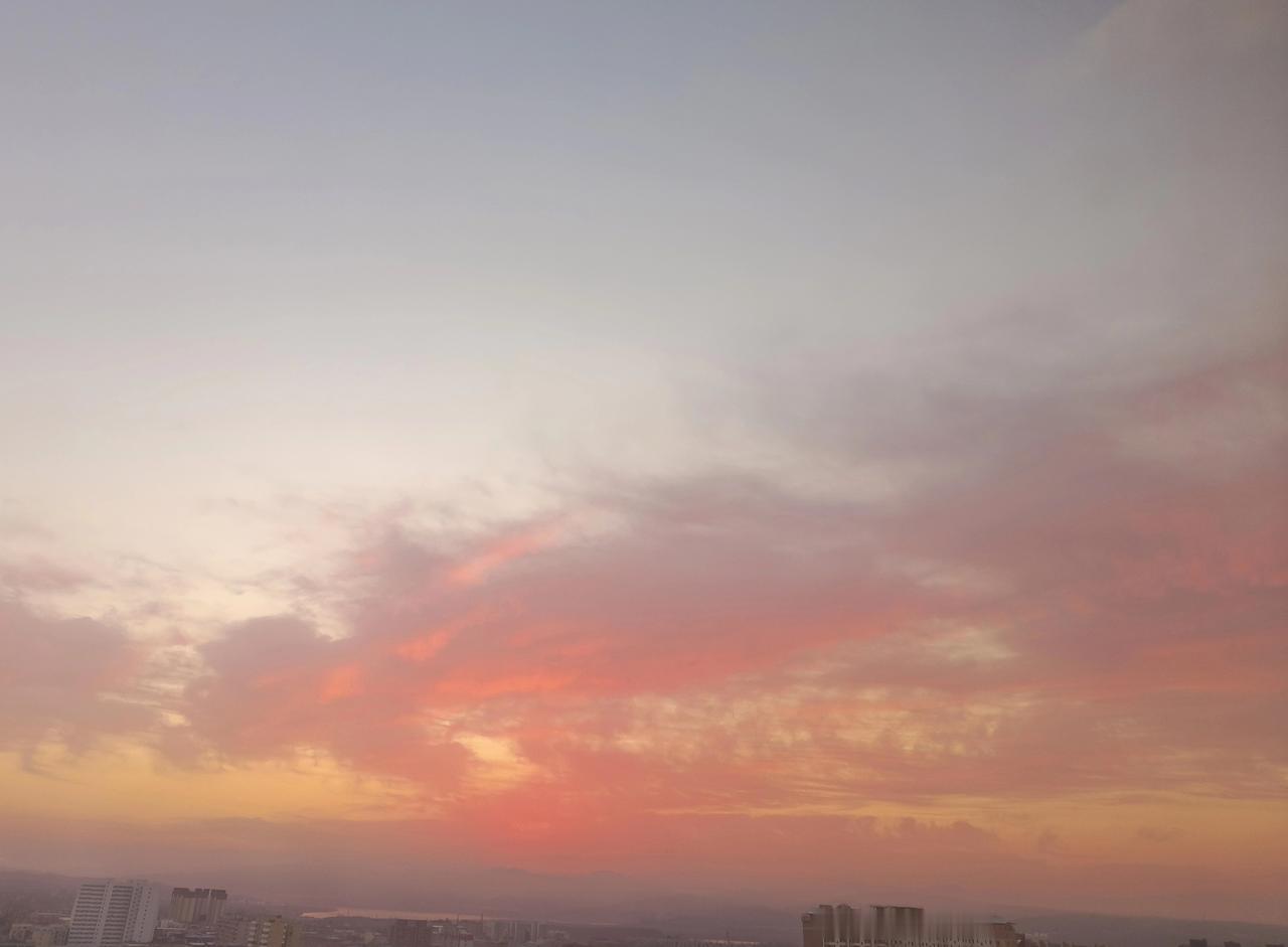 清晨的粉云 比镜头里更鲜活动人, 霞光刚漫上天际时, 云朵是嫩粉掺着桃红的模样, 像春日初开的桃花瓣揉进了云絮里。 层层叠叠的云被晨光染透, 边缘泛着细腻的珠光, 不是镜头里稍显暗沉的色调, 而是透亮的粉, 带着清晨的清冽与温柔。 楼宇还浸在薄晨雾里, 这片粉云却先一步醒过来, 在淡青色的天底舒展, 鲜活的色彩把清晨的朝气都揉进云纹里,可惜镜头没能留住那份透亮的粉艳。