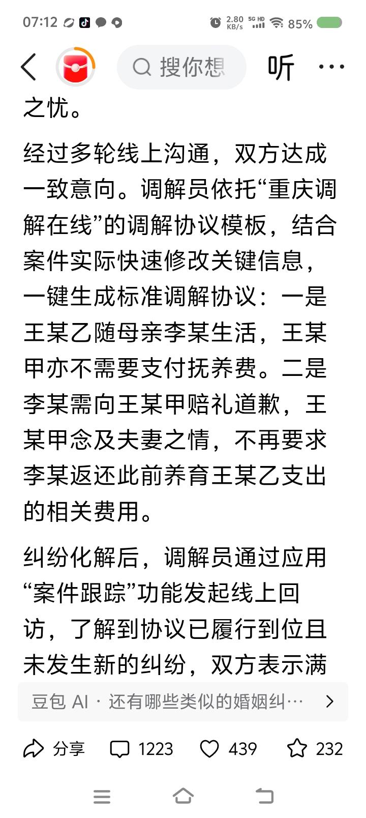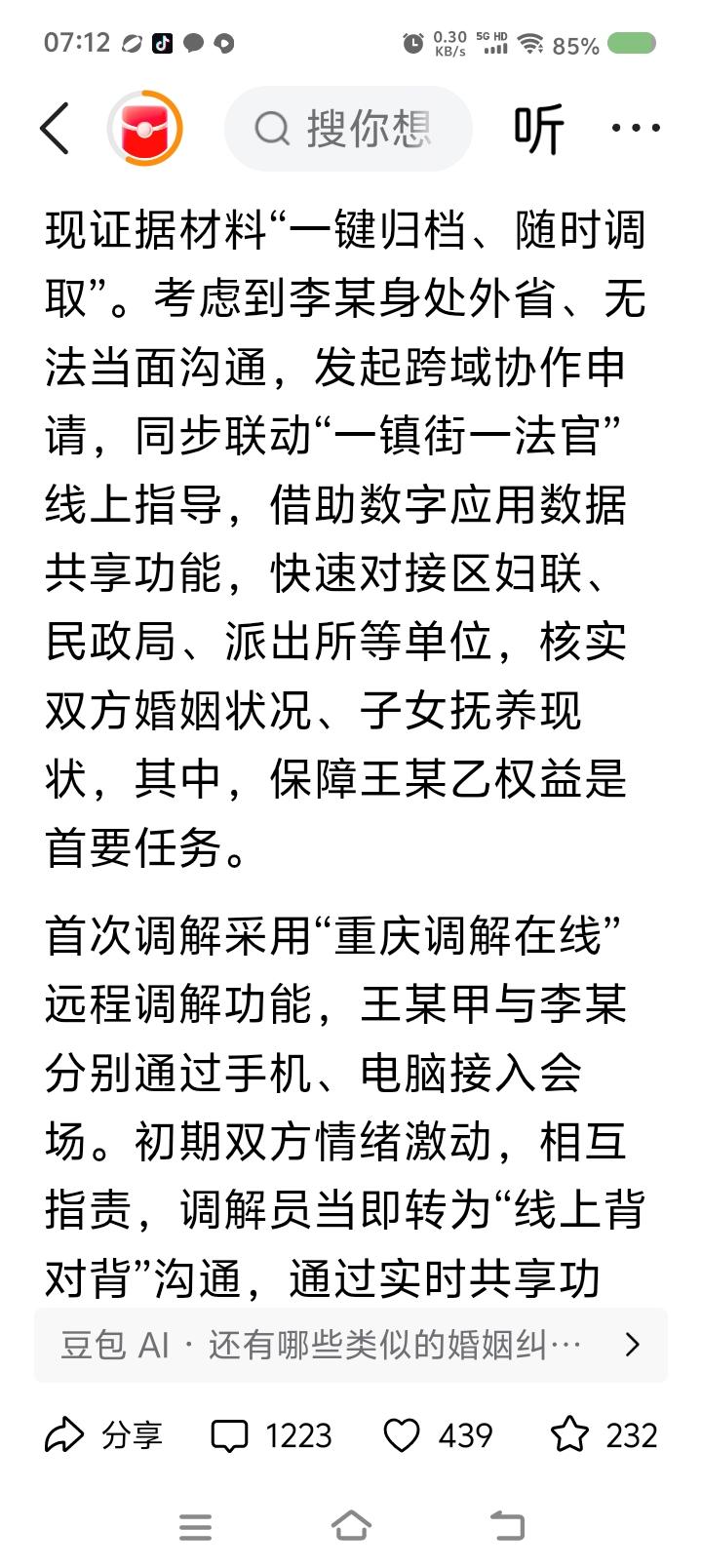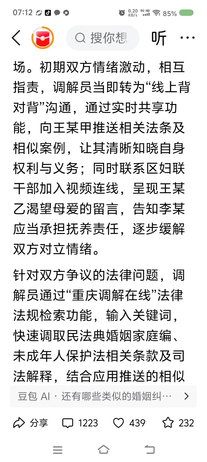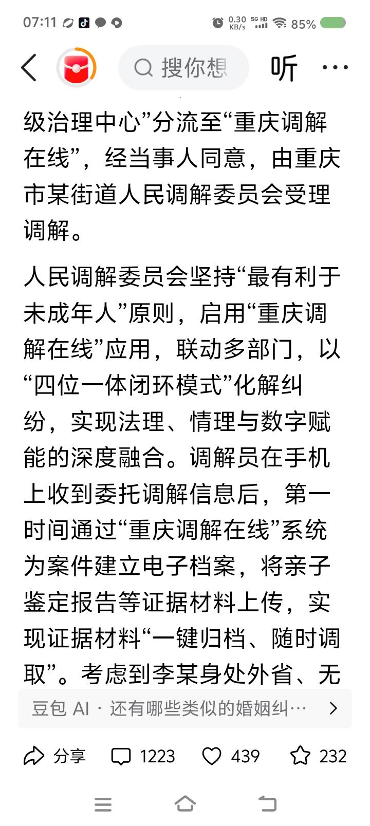 这么复杂?—— 据报道,最高法院等部门发布一起化解纠纷的案例。一男子发现13个月大的孩子非亲生,要求离婚,对方返还养育费用。辖区网格员发现纠纷后,上报“化解应用”,通过机制进入“调解在线”,经当事人同意,由当地调解委员会受理调解。 委员会联动多部门,以“四位一体闭环模式”化解,建档案,传证据……男子在外地,又发起跨域协作申请…… 点评: 停! 这么复杂吗? 这是调解还是法律运作? 有关部门投入的程序和模式太多了! 网格员上报→启动调解→正式调解,看起来三步,但你细细分,有多少步骤? 为了保留工作痕迹,为了不留下法律风险,有关部门投入大量人力物力财力,在流程上作文章。 有这三步就够了:确定事实——政策讲解——法律咨询。几名工作人员录像,纸质记录,最后归档。