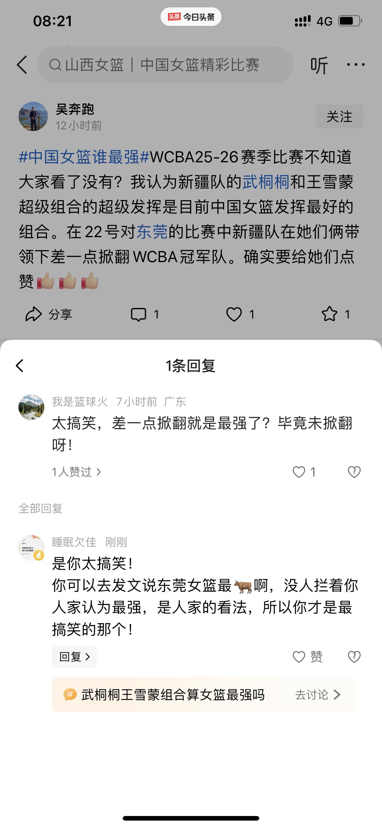 看到没,这就是广东女篮的某些球迷 (请看下面截图!) 人家新疆女篮球迷喜欢和支持自己的队伍和球员有什么错? 人家根据球员的精彩表现去夸赞自己所喜欢的球星有什么错? 答案就是没有一点错,是很正常很合理的一种行为 而且更重要的是,人家又没有恶意针对东莞女篮,只是单纯的想表达自己对新疆女篮的喜欢 没想到,就这样让某个广东女篮球迷内心破防了,直接就开始刻意地用言语去针对 所以啊,我想说,你们支持广东女篮的球迷们,不要以为每一个支持广东女篮的球迷都是很单纯的在支持你们的广东女篮!